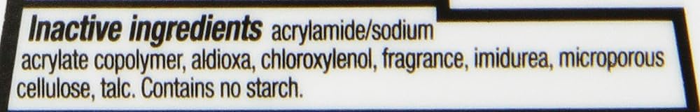 Inactive Ingredients: Acrylamide/Sodium Acrylate Copolymer, Aldioxa, Chloroxylenol, Fragrance, Imidurea, Microporous Cellulose, Talc.