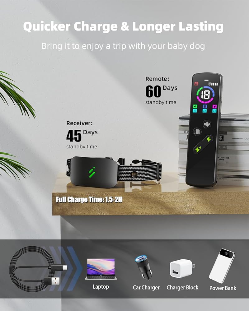 【شحن سريع ووقت استعداد ممتد】لا مزيد من الانتظار للحصول على طوق مشحون بالكامل! يمكن شحن كل من جهاز الاستقبال وجهاز التحكم عن بعد بسرعة خلال 1.5-2 ساعة باستخدام كابل شحن USB المرفق (وحدة الشحن غير متضمنة). يوفر جهاز الاستقبال وقت استعداد مذهل يصل إلى 45 يومًا، بينما يمتد جهاز التحكم عن بعد إلى وقت استعداد مذهل يصل إلى 60 يومًا. تدريب الكلب الخاص بك كلما وأينما تريد