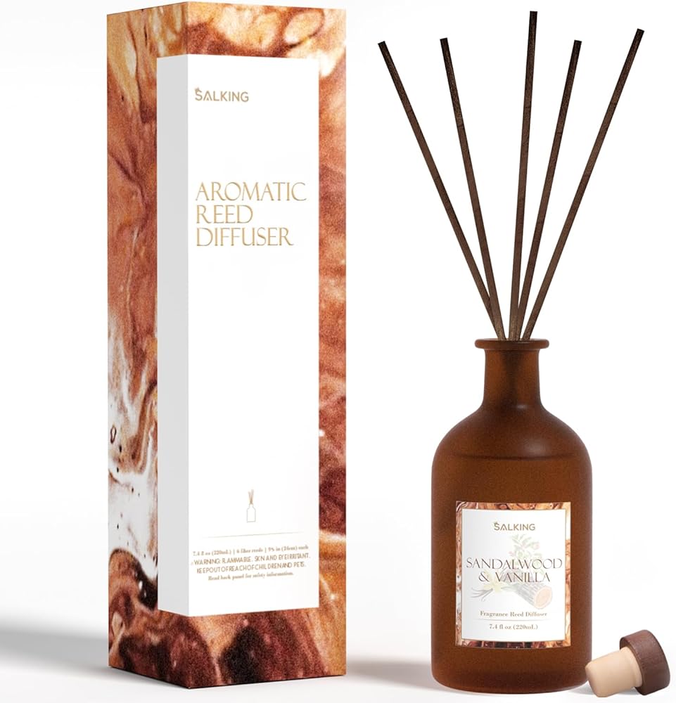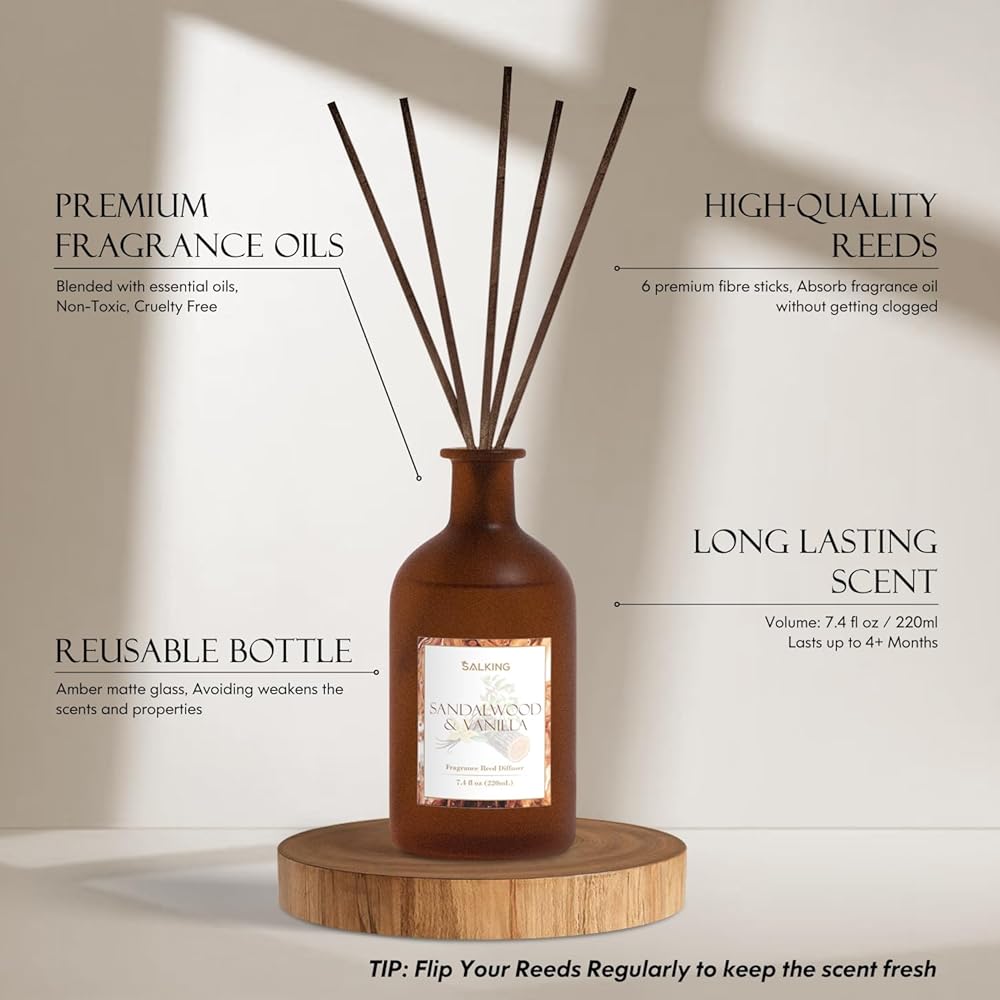 طبيعي وصديق للبيئة - إن موزع روائح القصب الخاص بنا الممزوج بأنقى الزيوت العطرية، هو شهادة على التزامنا بالجودة وغمر مساحتك بالروائح الأصلية لكنوز الأرض الوفيرة. مصنوع من مكونات عالية الجودة وغير سامة، يوفر موزع الروائح العطرية للمنزل طريقة آمنة وصديقة للبيئة لإنعاش مساحتك. يندمج البذخ الخشبي لخشب الصندل بسلاسة مع حلاوة الفانيليا المخملية، مما يخلق سيمفونية من الروائح التي يأسر وسحر.