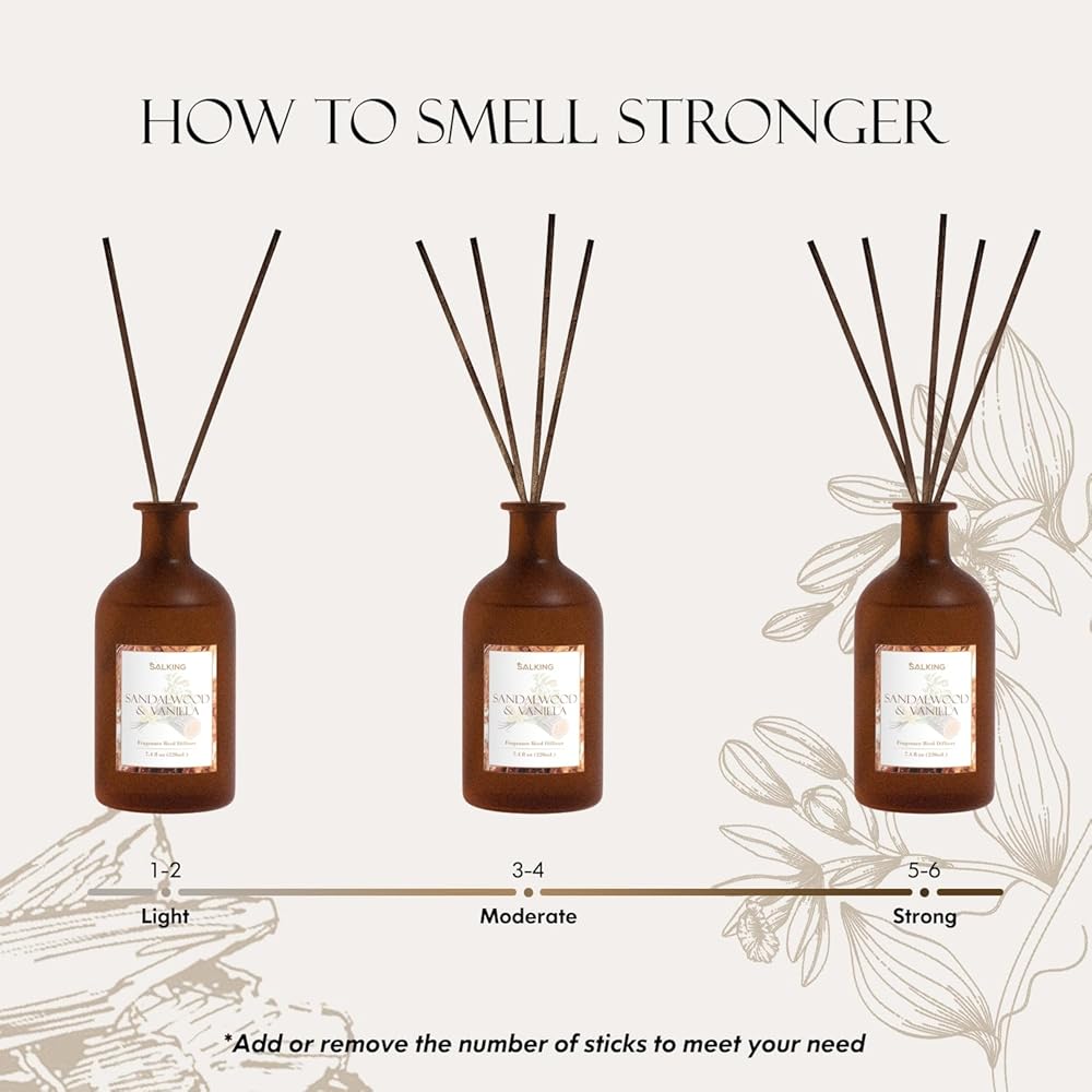 عطر يدوم طويلاً - استمتع بمتعة الاحتضان العطري الدائم مع موزع روائح القصب الخاص بنا. 6 أعواد توزيع زيوت من الألياف عالية الجودة، مزيج من زيت خشب الصندل الطبيعي والفانيليا العطري (7.4 أونصة)، تحتضن جاذبية العطر المستمر الذي سيدوم دون عناء لمدة 90-120 يومًا غير عادية. يمكنك التحكم في قوة العطر من خلال استخدام أعواد أكثر أو أقل. عندما تبدأ في ملاحظة تلاشي الرائحة، اقلب أعواد القصب.