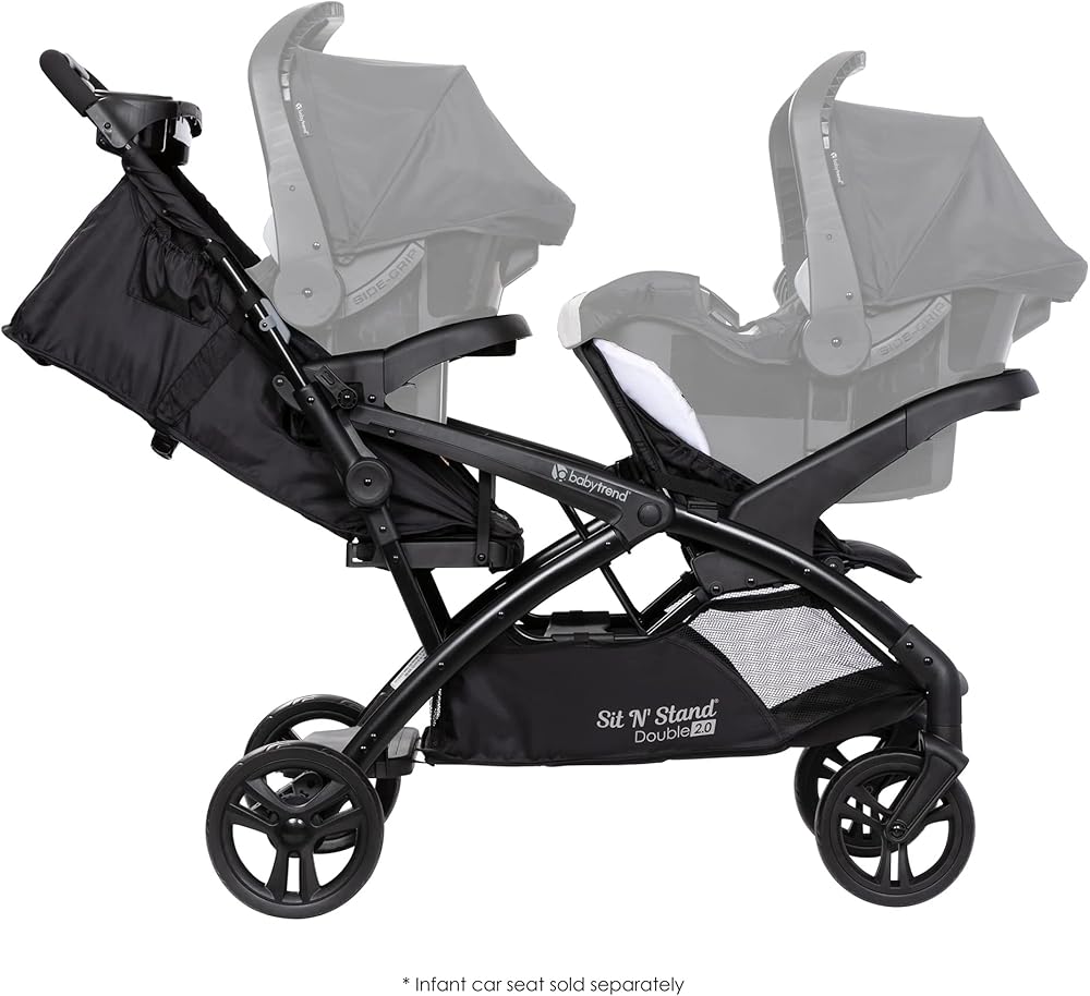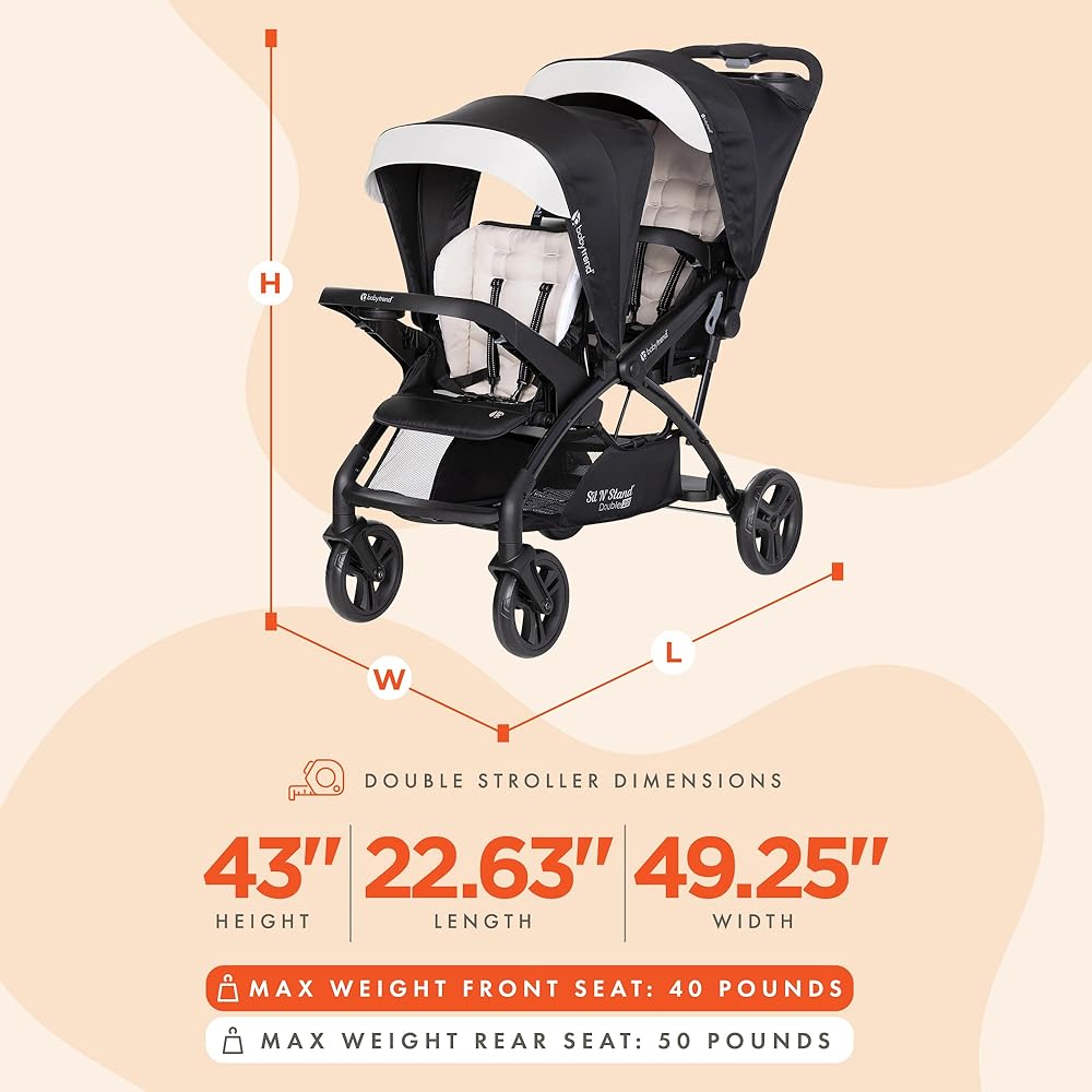 Children can sit in the front and rear seats of the stroller or stand on the rear platform, this stroller is compatible with Baby Trend car seats; Maximum weight capacity recommendation is 50 pounds