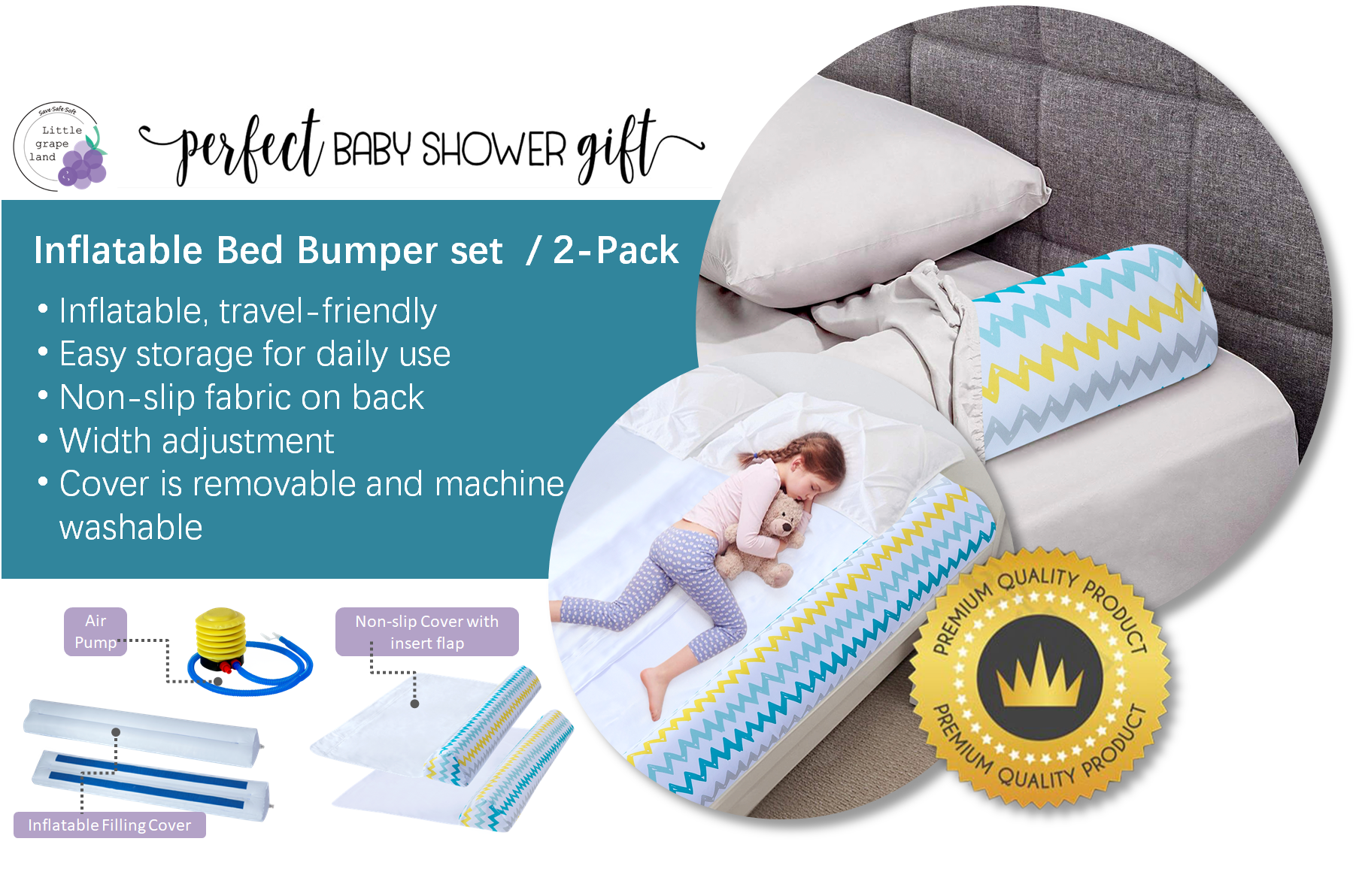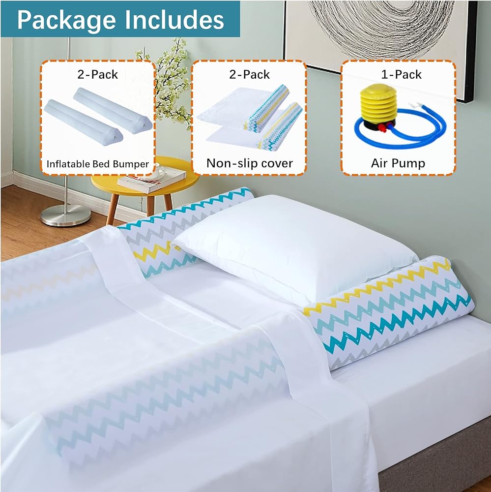 احمِ طفلك الصغير: ستساعد مصدات السرير القابلة للنفخ على منع النائمين النشيطين من التدحرج من السرير أو الانزلاق بين الجدار والسرير. عندما يلمس الطفل حارسًا أثناء النوم، فهذا تذكير لطيف بالحافة دون مقاطعة نومه الهادئ.