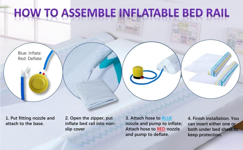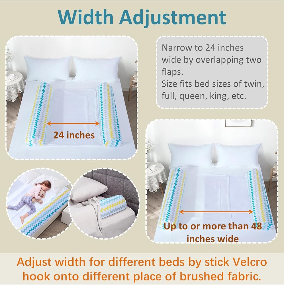 يناسب أي حجم سرير: مقاس 49 بوصة × 24 بوصة × 8 بوصة، تتوافق مصدات السرير القابلة للنفخ مع أي حجم سرير بما في ذلك سرير الأطفال الصغار أو سرير مزدوج أو كامل أو كوين أو سرير كبير الحجم للكبار. فقط قم بضبط خطاف الفيلكرو على القماش المصقول غطاء ليناسب عرض السرير المختلف.