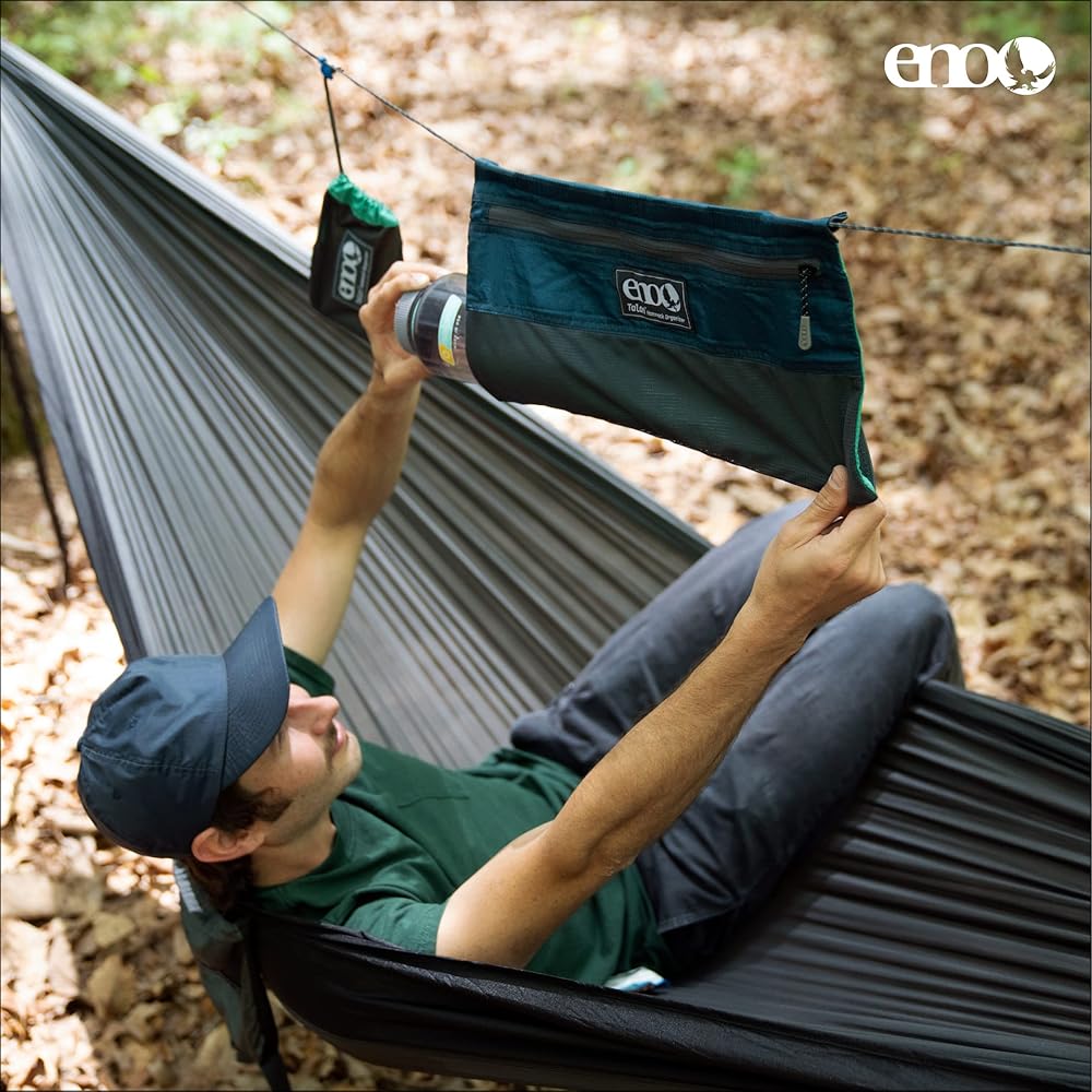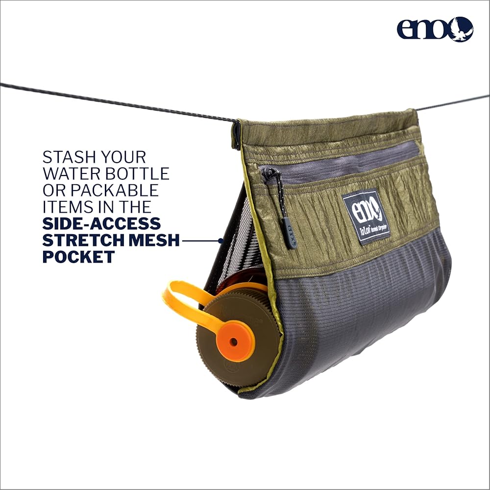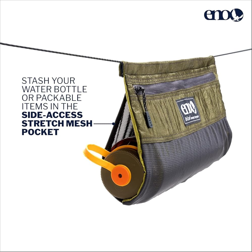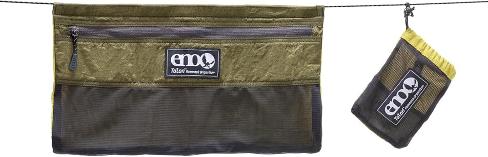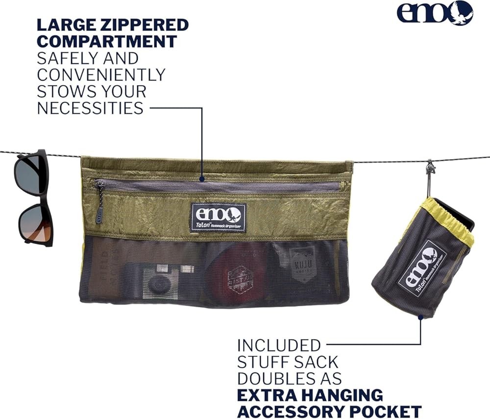 Explore, connect, and relax in the great outdoors with the ENO Talon Hammock Organizer. This innovative camping accessory is the perfect companion for anyone who loves to spend time hammocking. With its large zippered compartment, side-access stretch mesh pocket, and slidable design, this organizer bag is designed to keep your travel essentials within reach while you relax and enjoy the great outdoors.