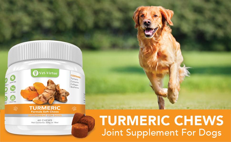 VET-VIRTUE الكركم للكلاب - الكركم العضوي مع الكركمين والورك والمفاصل للكلاب مضغ ناعم، مع الكولاجين والبيوبرين، امتصاص عالي يزيل التهاب آلام المفاصل - 60 قطعة