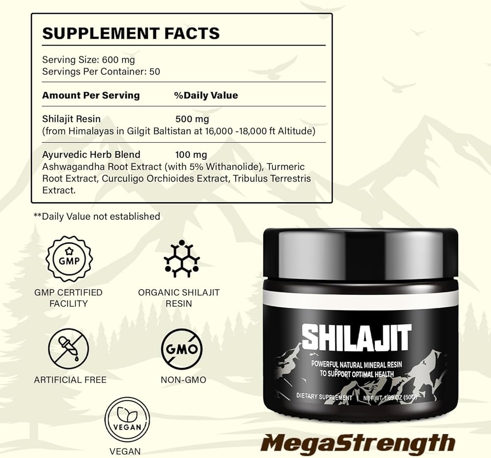 Ayurvedic Expertise: MegaStrength now presents Himalayan Shilajit Resin infused with a powerful Ayurvedic Blend. Each 600mg serving is meticulously designed to fortify your daily energy, resilience, and immune support. Our Grade A standards assure superior quality, your conduit to the world of Ayurveda.