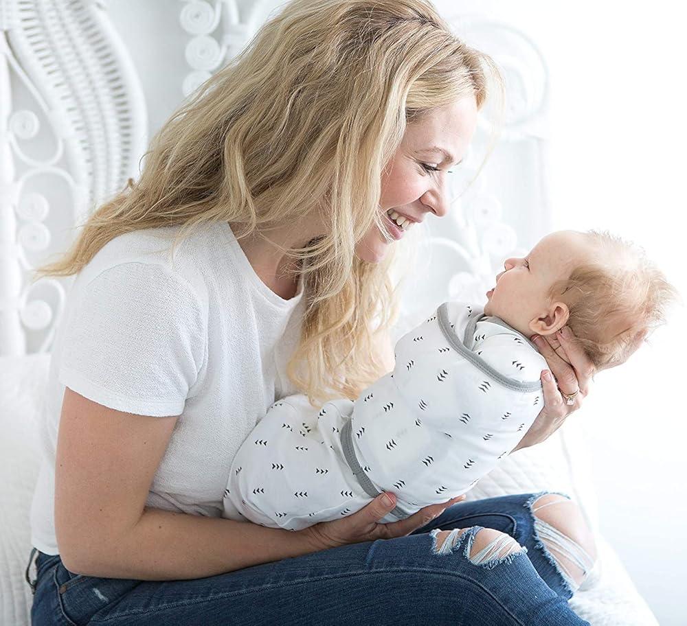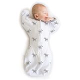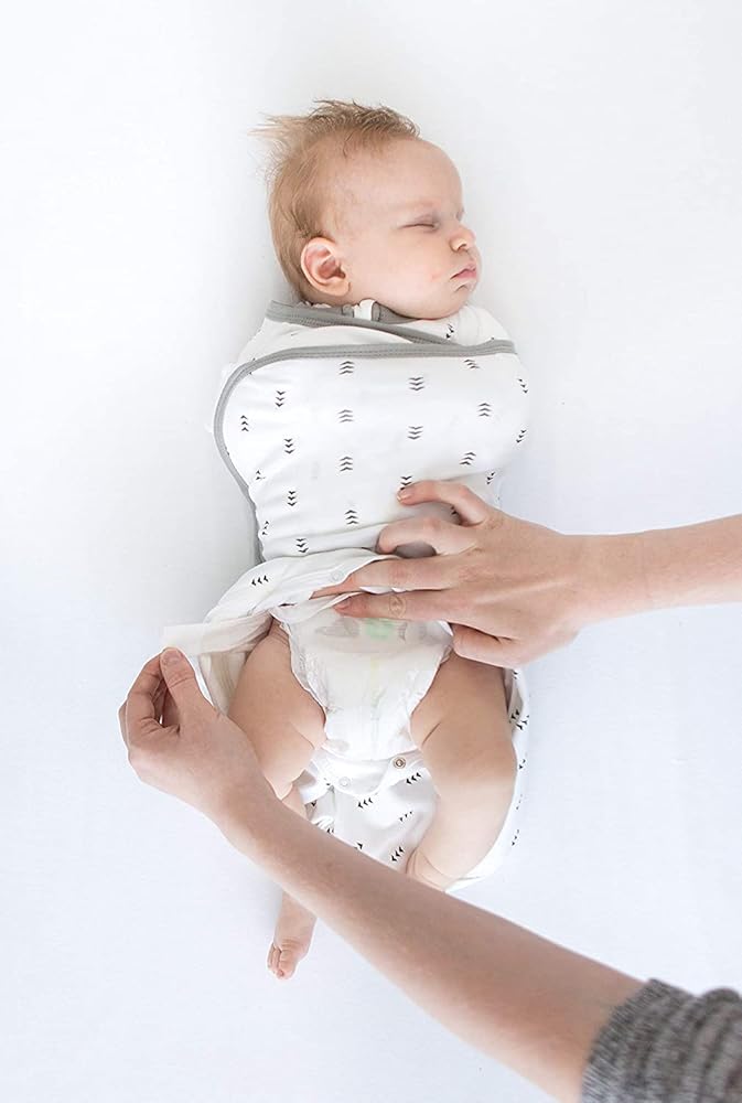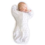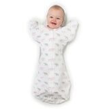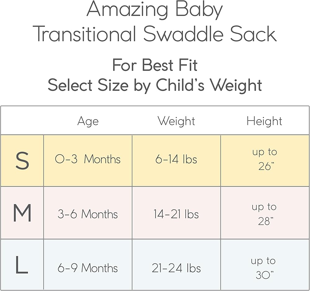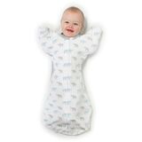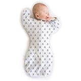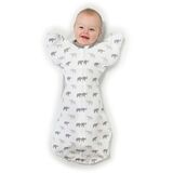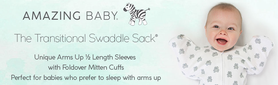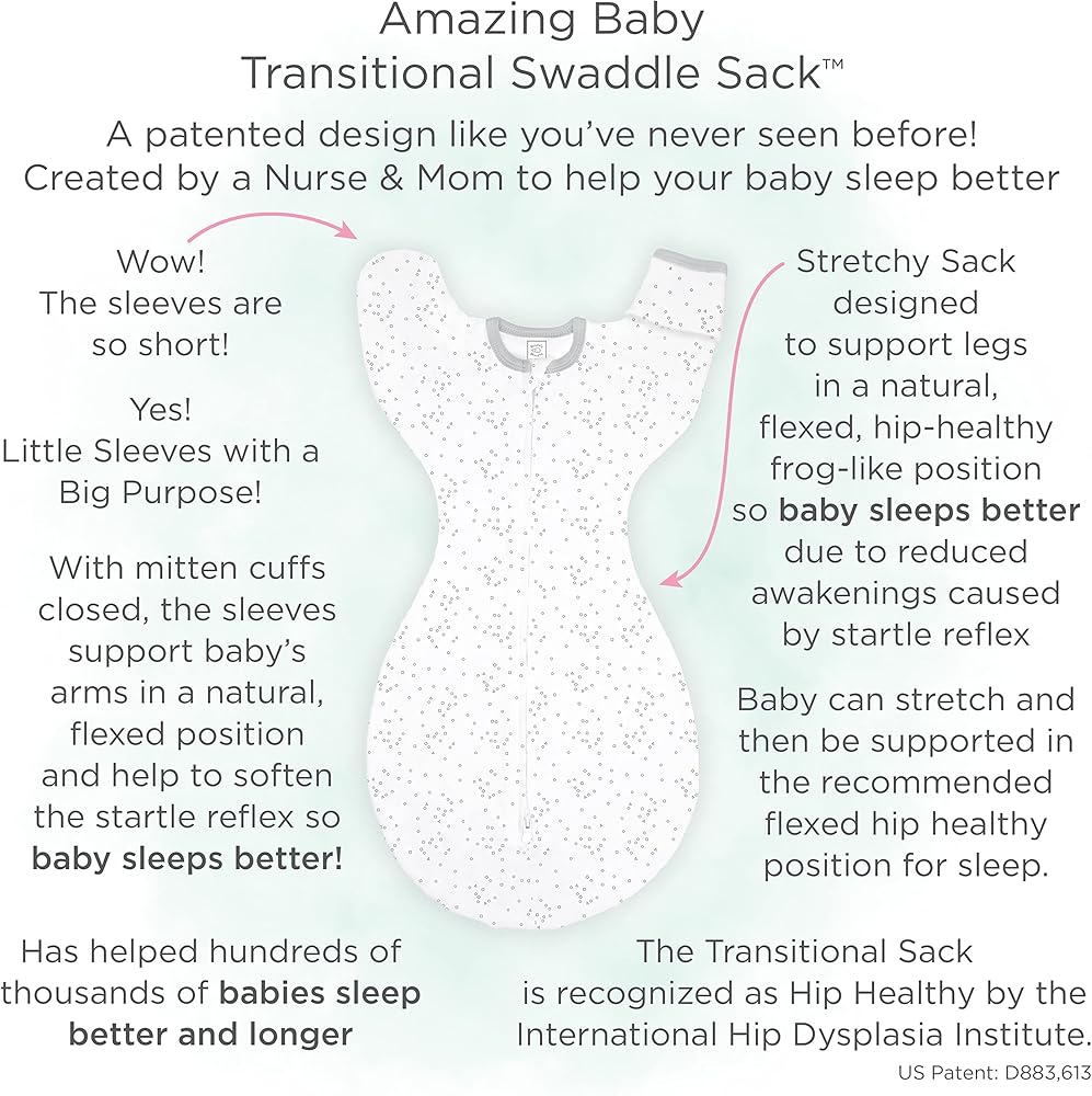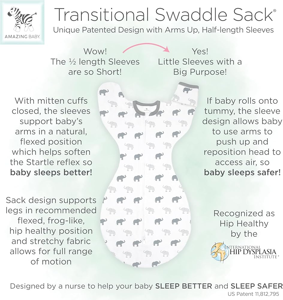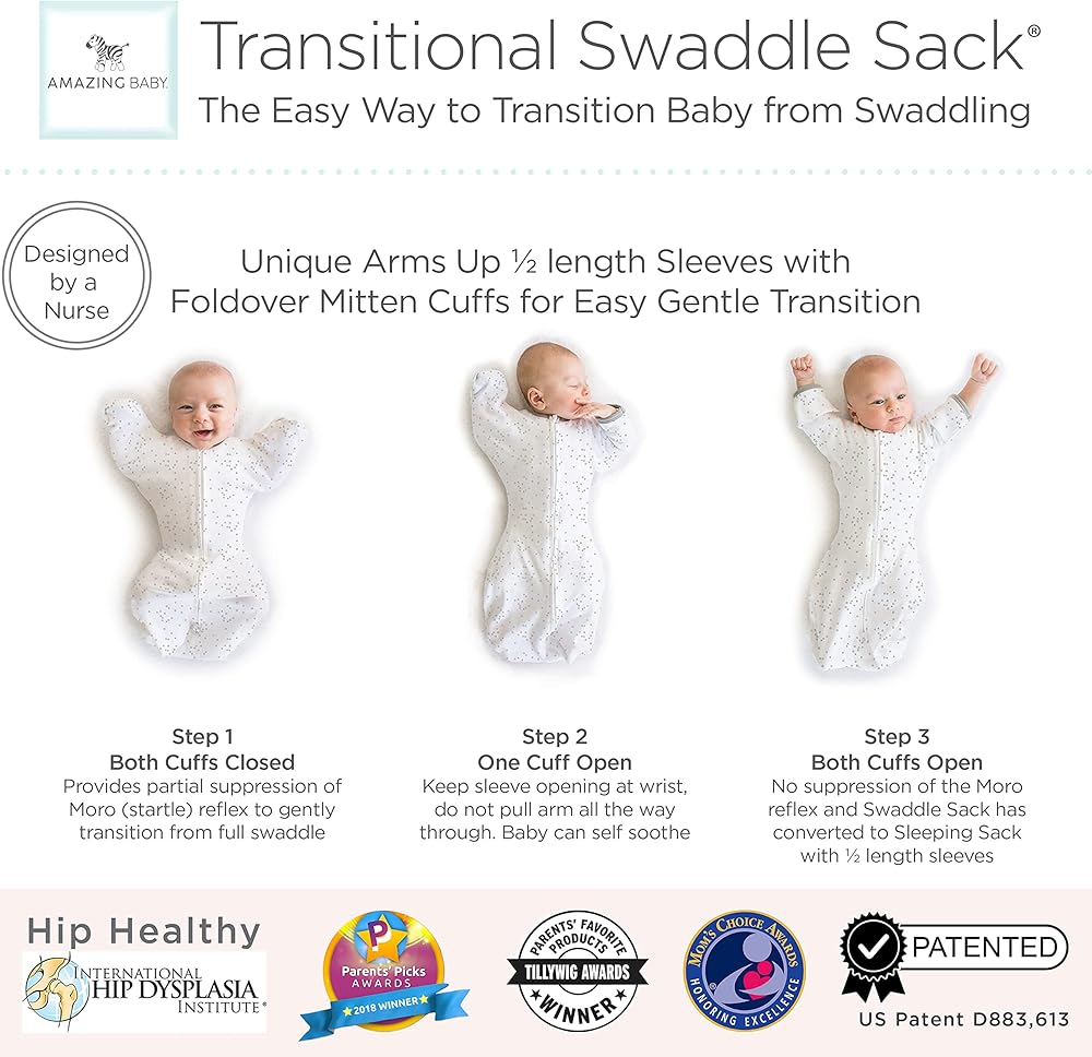 The Transitional Swaddle Sack is the easiest & safest way to transition baby from a traditional swaddle. The arms up sleeve design allows baby to self-soothe and the unique ½-length sleeves with foldover mitten cuffs closed provide partial suppression of the Startle Reflex to promote better sleep. Importantly, the patented design is safer because baby can use their arms if baby rolls over during sleep. The Transitional Swaddle Sack is ideal for babies who prefer to sleep with arms up, babies who are starting to rollover, and babies who break out of a traditional swaddle. Designed by a nurse, the Transitional Swaddle Sack's innovative design features uniquely shaped, ½-length sleeves with foldover mitten cuffs to partially suppress the Startle Reflex that can wake a sleeping baby. Unlike a traditional swaddle where baby's arms are fully restrained, the Transitional Swaddle Sack supports baby in a natural position for better sleep, and allows baby to access hands to self-soothe, which is important because self-soothing helps baby sleep better and longer. The uniquely-shaped, ½-length sleeves are not full length, so when mitten cuffs are closed, baby's arms will be flexed close to body for swaddle snugness. When the mitten cuffs are closed and baby is placed in the Transitional Swaddle Sack, the arms up sleeves position baby's arms in a flexed, close-to-body, arms-up position. The shape and length of the sleeves help partially suppress the startle reflex. The foldover mitten cuffs may be worn open or closed. The caregiver can open one or both cuffs, so baby can self-soothe by sucking directly on baby's hand or close the cuffs to protect baby from facial scratches and provide partial suppression of the Startle Reflex. To dress baby, parents are encouraged to close the cuffs first, and then place baby in the sack. If the caregiver wants to allow baby to suck directly on hands, then open one or both mitten cuffs. When both mitten cuffs are open, the sleeves will allow full range of motion and the sleeves will not suppress the Startle Reflex. The American Academy of Pediatrics (AAP) strongly recommends that parents stop restraining baby's arms in a traditional swaddle when baby shows signs of starting to roll over. The Transitional Swaddle Sack is a safer option for babies who can rollover or showing signs of trying to roll over. If baby rolls over, the Transitional Swaddle Sack sleeves are designed to allow baby to use their arms to push up and lift head to reposition their head to get access to air. Many parents love the Transitional Swaddle Sack because when baby outgrows swaddling and doesn't sleep well in a sleeveless sleeping sack, the Transitional Swaddle Sack is a lifesaver because baby sleeps better and longer. The Transitional Swaddle Sack's mid-section is slightly tapered to provide swaddle snugness around baby's tummy. The lower section of the sack is less spacious than a typical sleeping sack, and is designed to support baby's legs in a natural flexed position, provides some suppression of the Startle Reflex for the legs. The stretchy fabric allows baby to stretch and feel the boundaries of the sack which helps baby feel secure. The design has been recognized as Hip Healthy by the International Hip Dysplasia Institute. The 2-way zipper makes the Transitional Swaddle Sack easy to use. The zipper has two zipper pulls – one at the neckline and one at the foot of the sack. The zipper zips down from the top to make it easy to place baby in the sack and zips up from the bottom to make it easy to change baby's diaper. The Transitional Swaddle Sack is made from premium, stretchy cotton knit and exclusive designer prints. The premium cotton fabric is machine washable. Winner of multiple awards including the Mom's Choice Award, Parent's Pick Award, and Tillywig Award. US patent, D833,613, with patents in EU, UK, Japan, Korea, China, and countries around the world. Swaddle Sack is a registered trademark of SwaddleDesigns.