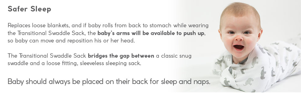 • The TRANSITIONAL SWADDLE SACK allows baby to SELF-SOOTHE and promotes BETTER SLEEP and SAFER SLEEP; Perfect for babies who prefer to sleep with ARMS UP babies who are starting to rollover and babies able to break out of a traditional swaddle