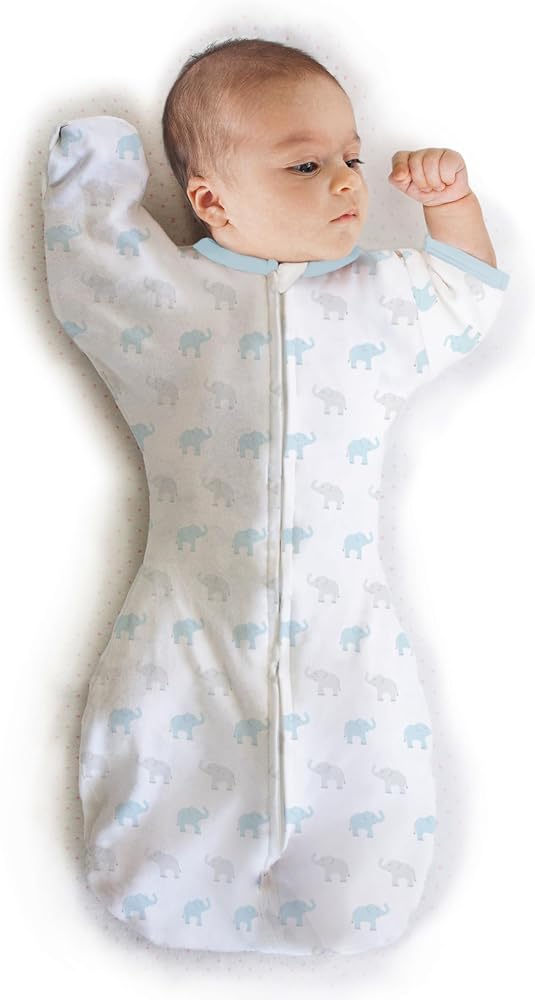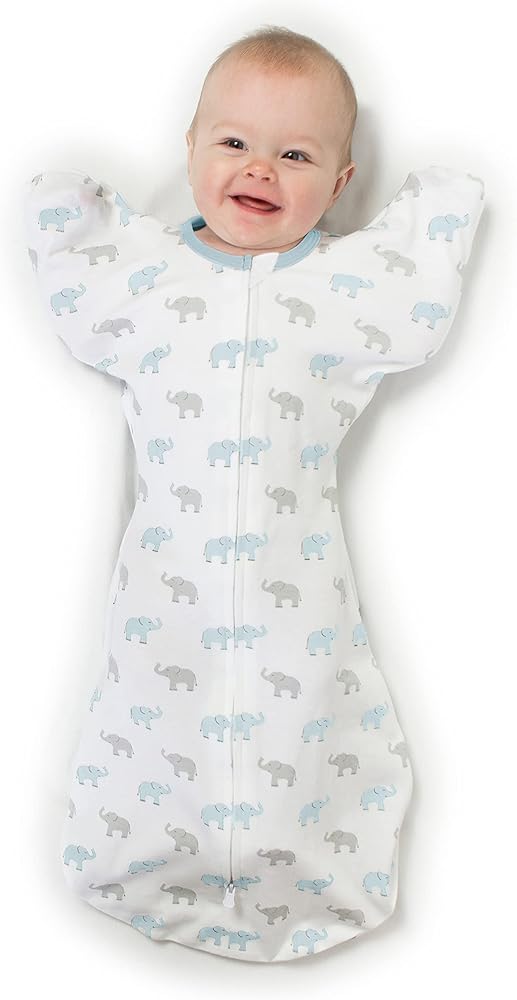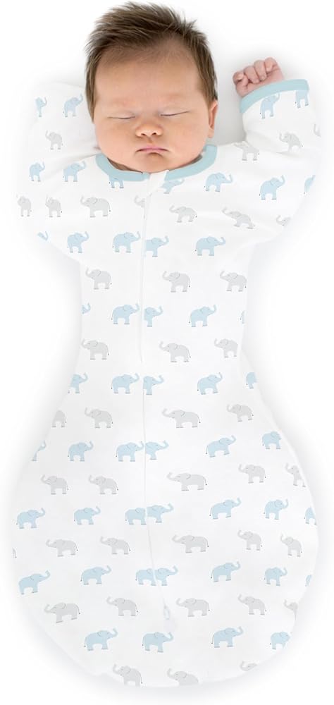 كيس قماط انتقالي رائع للأطفال مع أذرع وأكمام نصف طول وأساور قفازات، صغير، 0-3 أشهر، 6-14 رطل، فيلة صغيرة، أزرق (قماط للذراعين، كيس نوم قماط انتقالي)