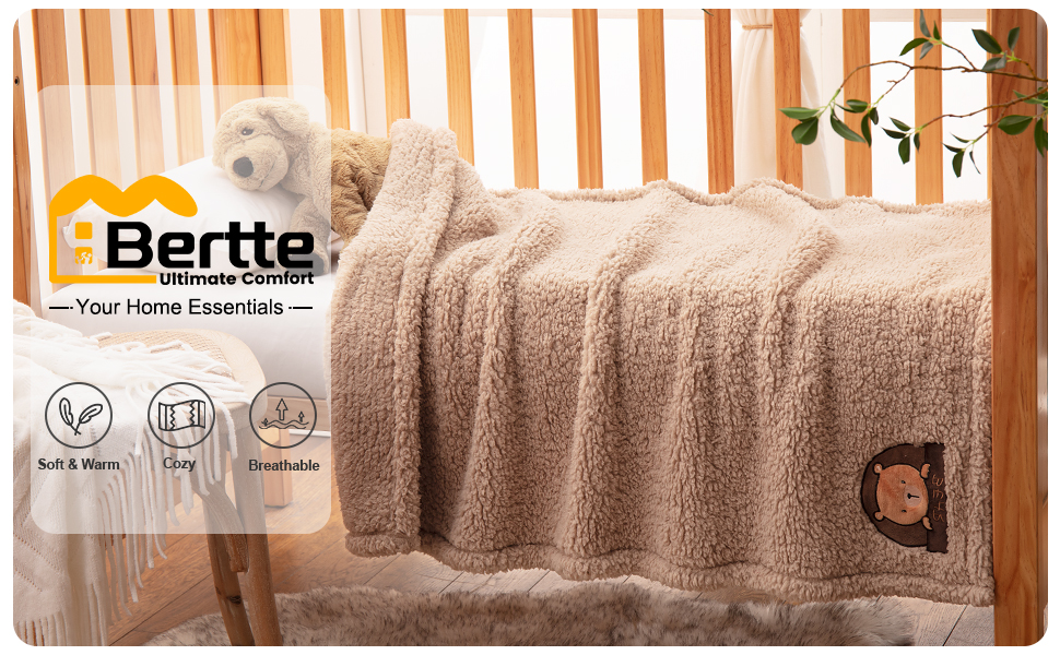 ناعمة ودافئة - بطانية الأطفال Bertte Sherpa مصنوعة بنسبة 100% من ألياف دقيقة عالية الجودة قابلة للتنفس وحرارة مع لمسة ناعمة لا تصدق. إنه يوفر درجة حرارة مريحة للنوم أو القيلولة والتي تهدئ وتهدئ طفلك من أجل نوم مريح. فائقة النعومة ودافئة ومريحة لبشرة طفلك الحساسة.