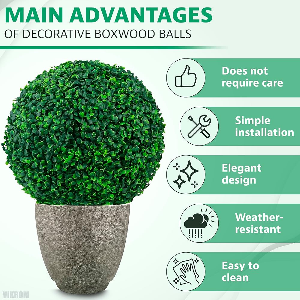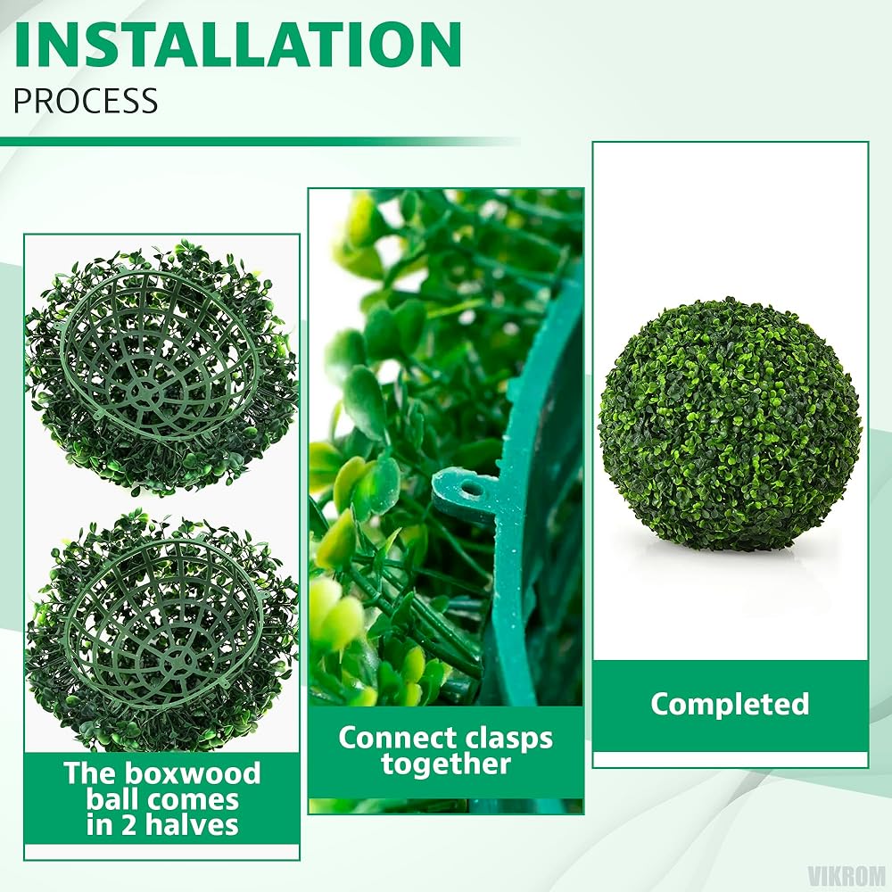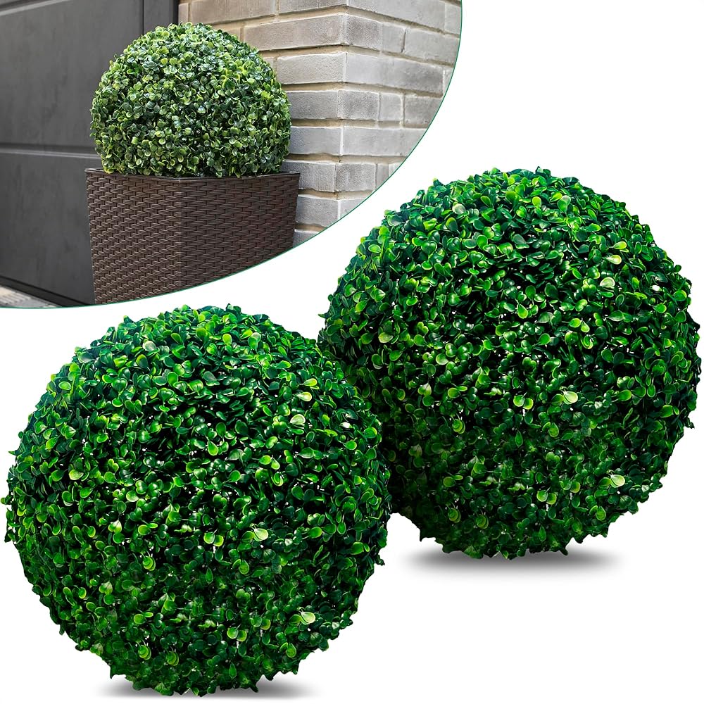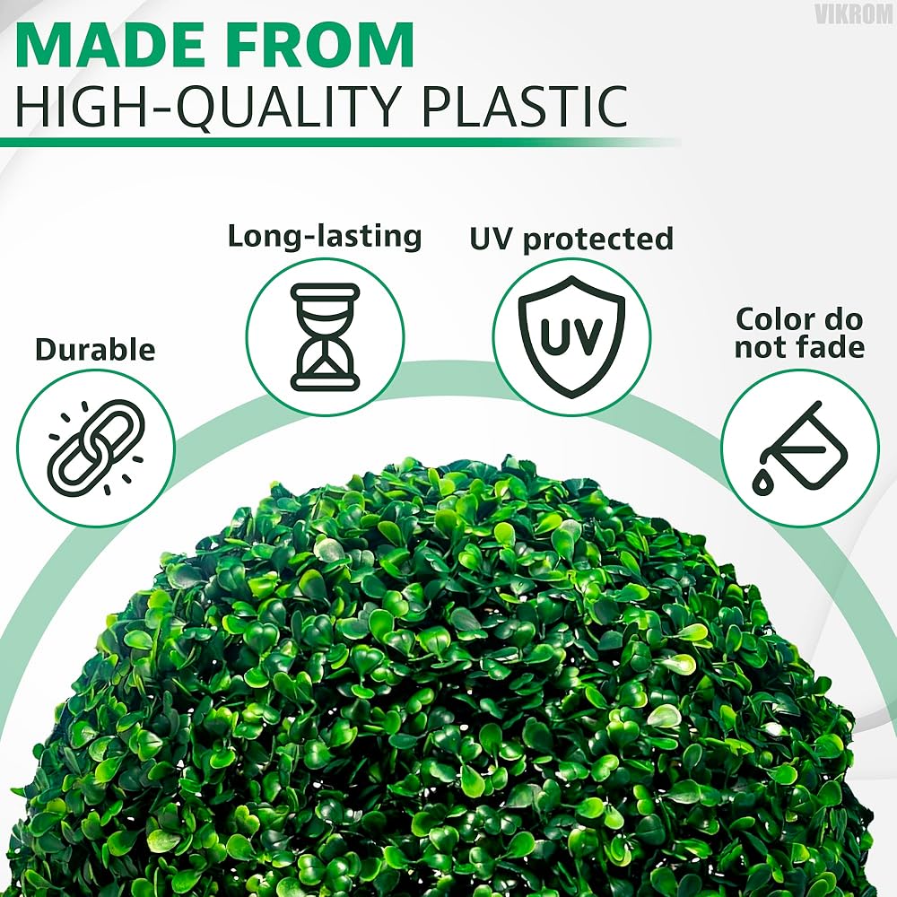 Vikrom Green Artificial Boxwood Wall Garden Ball Faux Topiary Indoor Decorative Balls for Centerpiece Bowls: The boxwood wall artificial plants for outdoor decor is made of high quality plastic by modern technology. These faux boxwood topiary balls look the same as the real but more long-lasting than it. These outdoor plants artificial for porch are perfect for both indoor and outdoor decor. These artificial plants for home decor outdoor are bushy, bright green leaves with clear texture, realistic leaves, evenly-trimmed shape and natural color, adding more life to your space but without maintenance, watering or trimming needed like real plants. The artificial topiary ball is the perfect decoration for home entrance, living room, balcony, reception area, decorative balls for bowls, office, party, wedding and more. These faux topiary outdoor boxwood balls can be widely used in wedding, balcony, porch, party, reception, backyard, living room, patio, office room, wall ways, etc. Specifications: Material: Plastic Color: Green Size: inner diameter: 11.41 inches, outer diameter: 15.74 inches Package Contents: 2 x Artificial Boxwood Plant Ball Note: Light Shooting And Different Displays May Cause The Color Of The Item In The Picture A Little Different From The Real Thing. The Measurement Allowed Error Is /- 1-3cm.