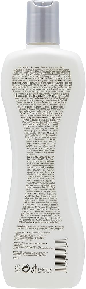BioSilk Therapy Moisturizing Shampoo for Dogs features the same classic ingredients and innovative technology as the original and revolutionary BioSilk Silk Therapy line for humans. Luxuriously formulated with silk and enriching vitamins, this dog shampoo's properties work together to restore the moisture balance to your puppy's coat. BioSilk Therapy Moisturizing Shampoo Spray for Dogs gently cleanses and locks in moisture for a soft, shiny and healthy looking coat. It's a great way to alleviate dry skin and itchiness in your dog. Great for all dogs of every breed and size, this dog shampoo cleans, moisturizes, and helps eliminate odors to keep your dog smelling fresh and clean. BioSilk dog products are pH balanced for dogs making them the perfect bath time solution for your fur baby. They are free from sulfates and parabens, and safe for use with topical flea and tick treatments. Get your BioSilk Moisturizing Shampoo for Dogs today and your dog will be clean, shiny, and soft before you know it. Directions: Using warm water, wet your dog's coat thoroughly. Apply dog shampoo from back of ears to tail, carefully avoiding eyes. Lather and gently massage deep into coat and skin. Rinse well. Repeat as needed. For external use only. Safe for dogs 8 weeks of age or older. Keep out of reach of children or pets. Ingredients: Water, Natural Cleansing Agents, Moisturizing Ingredients, Silk Protein, Soy Protein, Oat Extract, Fragrance. Contains no parabens, artificial colors, or sulfates. YOUR SATISFACTION IS OUR PRIORITY* — If you have any questions or feedback, please reach out to us.