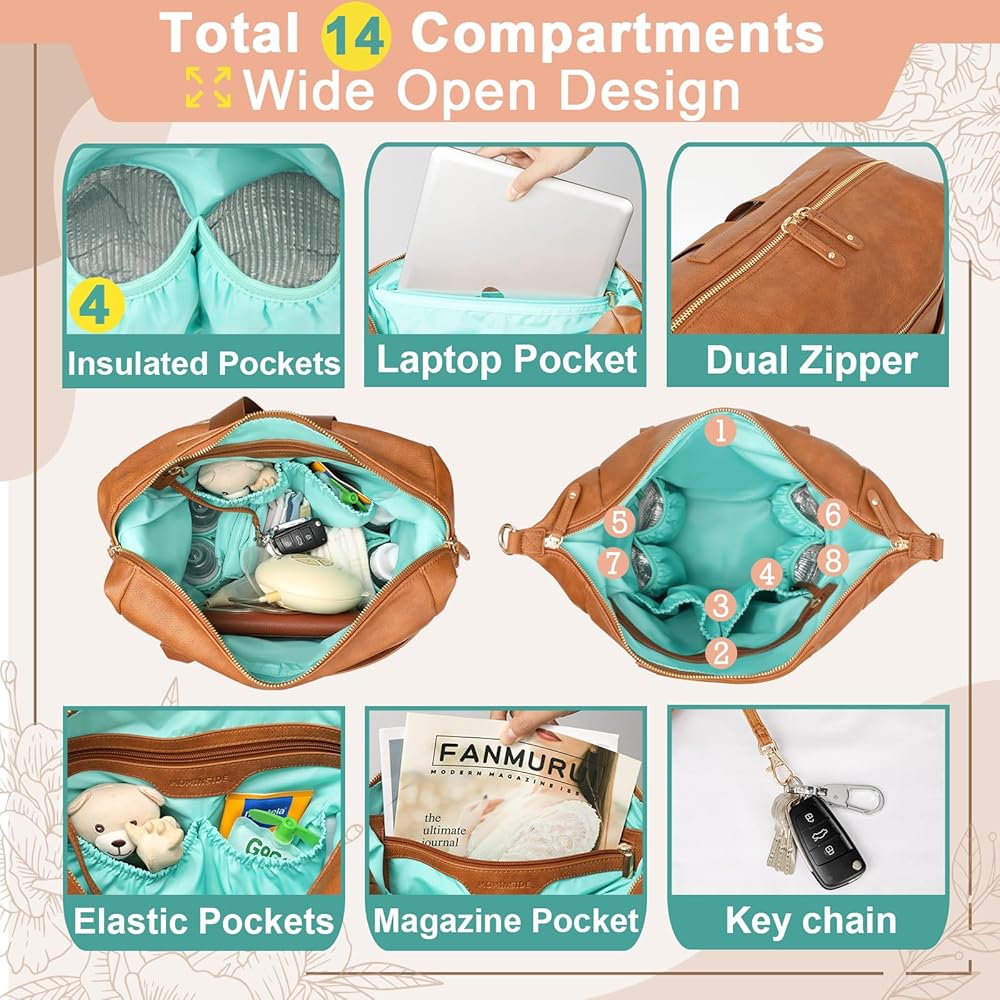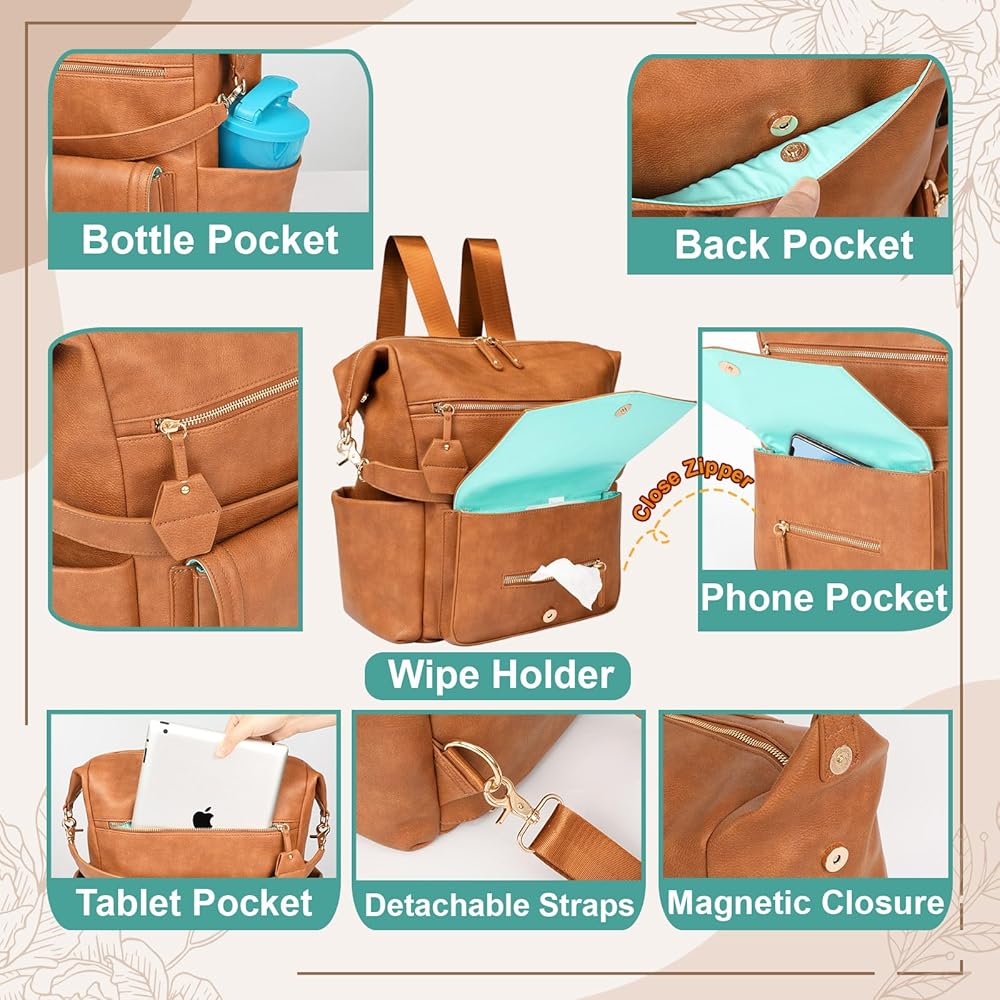 ❤️[حامل للمناديل، مساحة تخزين متعددة الاستخدامات] جيب أمامي بغطاء مغناطيسي، فتحة لحقيبة المسح، يمكن استخدامه أيضًا كجيب عادي عن طريق إغلاق السحاب. ★6 جيوب للزجاجات، تتضمن 4 جيوب معزولة تناسب زجاجات الأطفال بسعة 6 أونصة، وتحافظ على الزجاجات دافئة/باردة. ★جيوب داخلية بسحاب لحمل الكمبيوتر المحمول مقاس 15 بوصة، وواحدة للمجلات. ★جيب خلفي مضاد للسرقة للحفاظ على أمان جهاز iPad أو الهاتف أو المحفظة. ★حامل المفاتيح، لن يفقد مفاتيحك أبدًا في الجزء السفلي من حقيبتك.