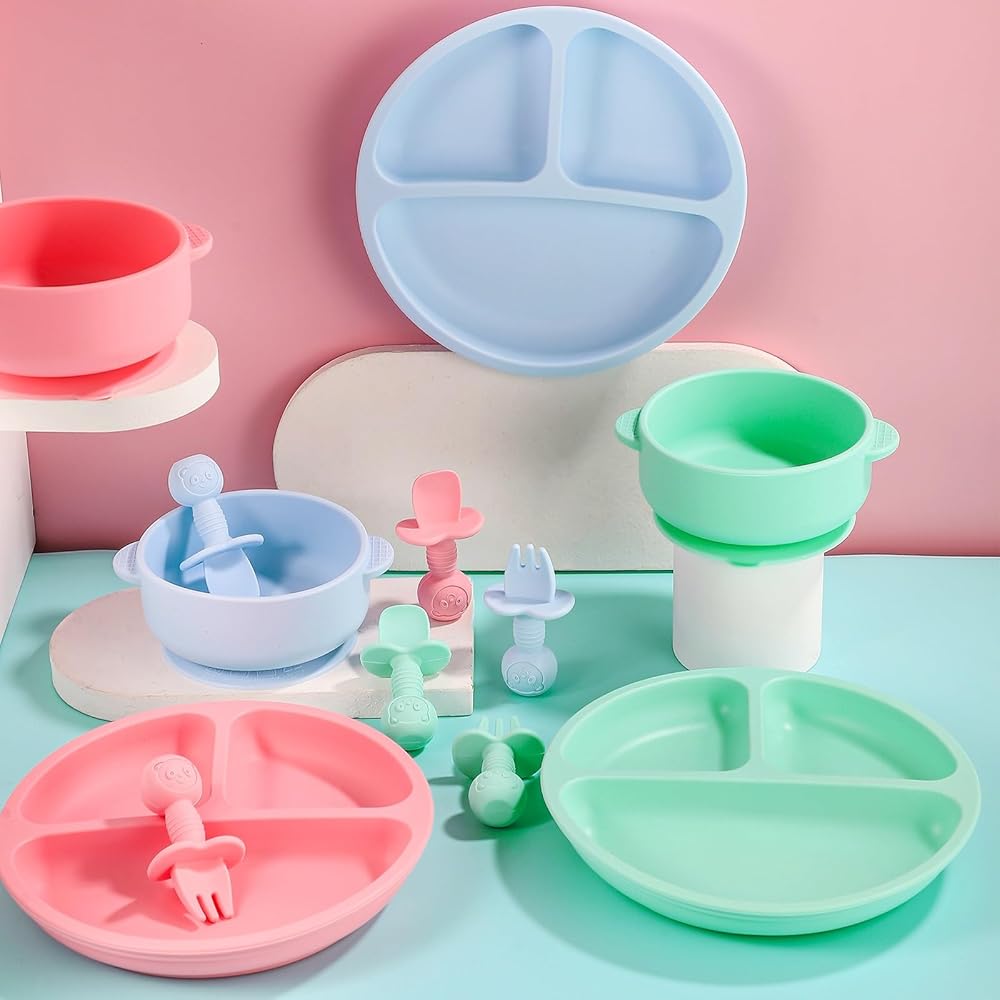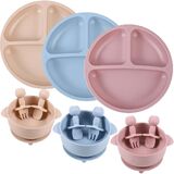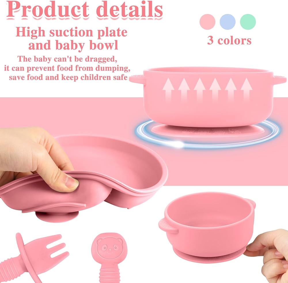 • قوة شفط قوية: قواعد الشفط الكبيرة تربط الوعاء والطبق بأمان على أي سطح أملس، بما في ذلك صواني الكراسي العالية، مما يضمن وجبات خالية من الفوضى لأطفالك