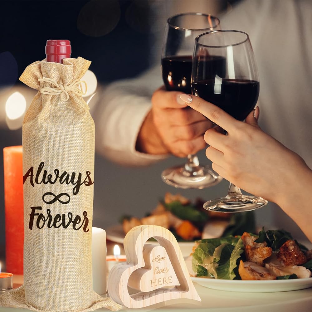 【كيس النبيذ وشمعة عطرية】حقيبة النبيذ الرائعة، المطبوعة عليها دائمًا إلى الأبد، جنبًا إلى جنب مع الزخرفة على شكل قلب، تنقل البركة للزوجين المتزوجين حديثًا. ومن ناحية أخرى، تمكنهم شمعة العلاج العطري المعطرة بالفريزيا من استرخاء أجسادهم وعقولهم، والانغماس في جو من السعادة. هذه الهدية ليست مجرد قطعة، ولكنها أيضًا شهادة حب.