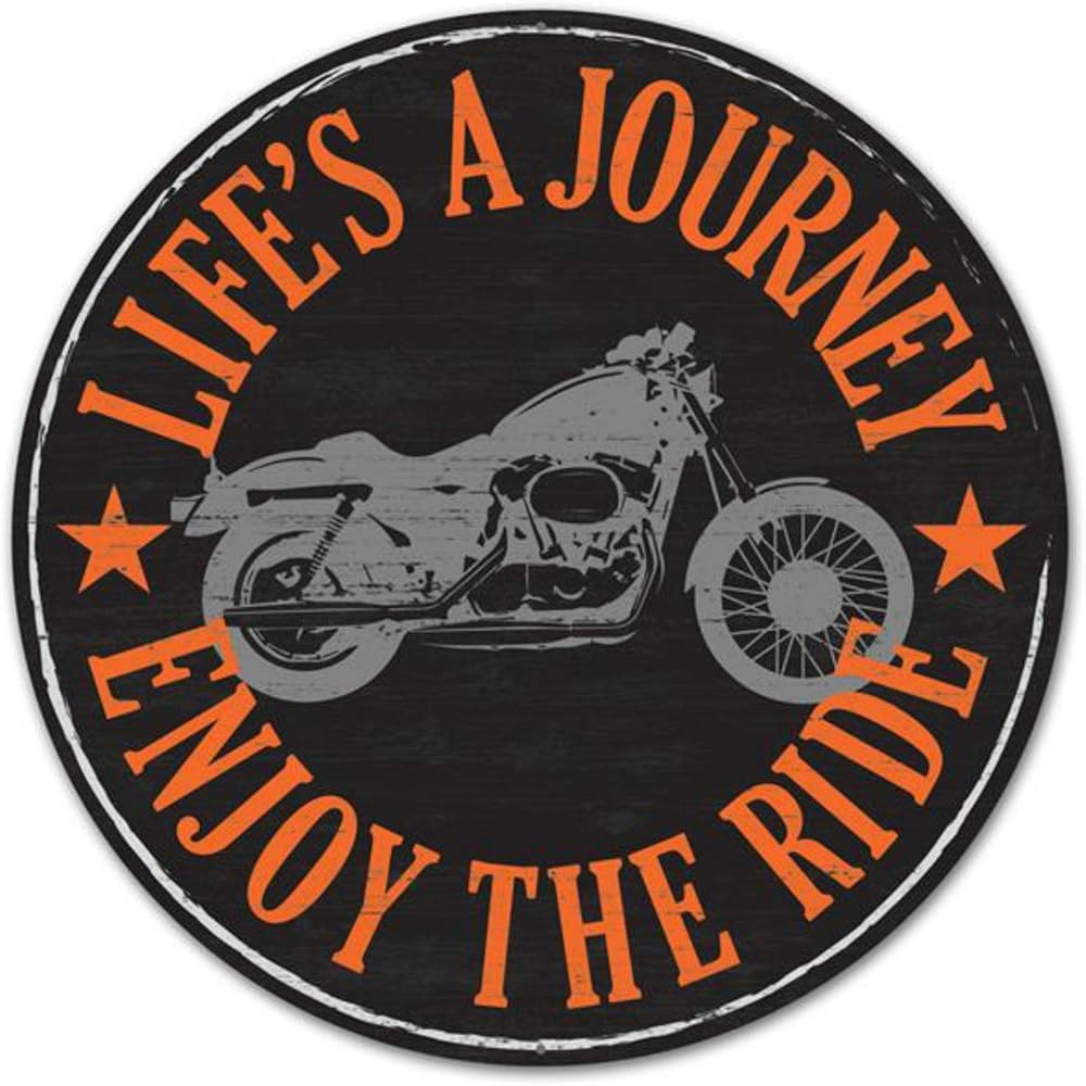 This metal round metal sign gray motorcycle and reads "Life's a Journey Enjoy The Rice" in bright orange. Dimension: 12" in diameter and 1/16" thick. There are 2 small holes already drilled out along edge (3MM openings) for easy attachment.