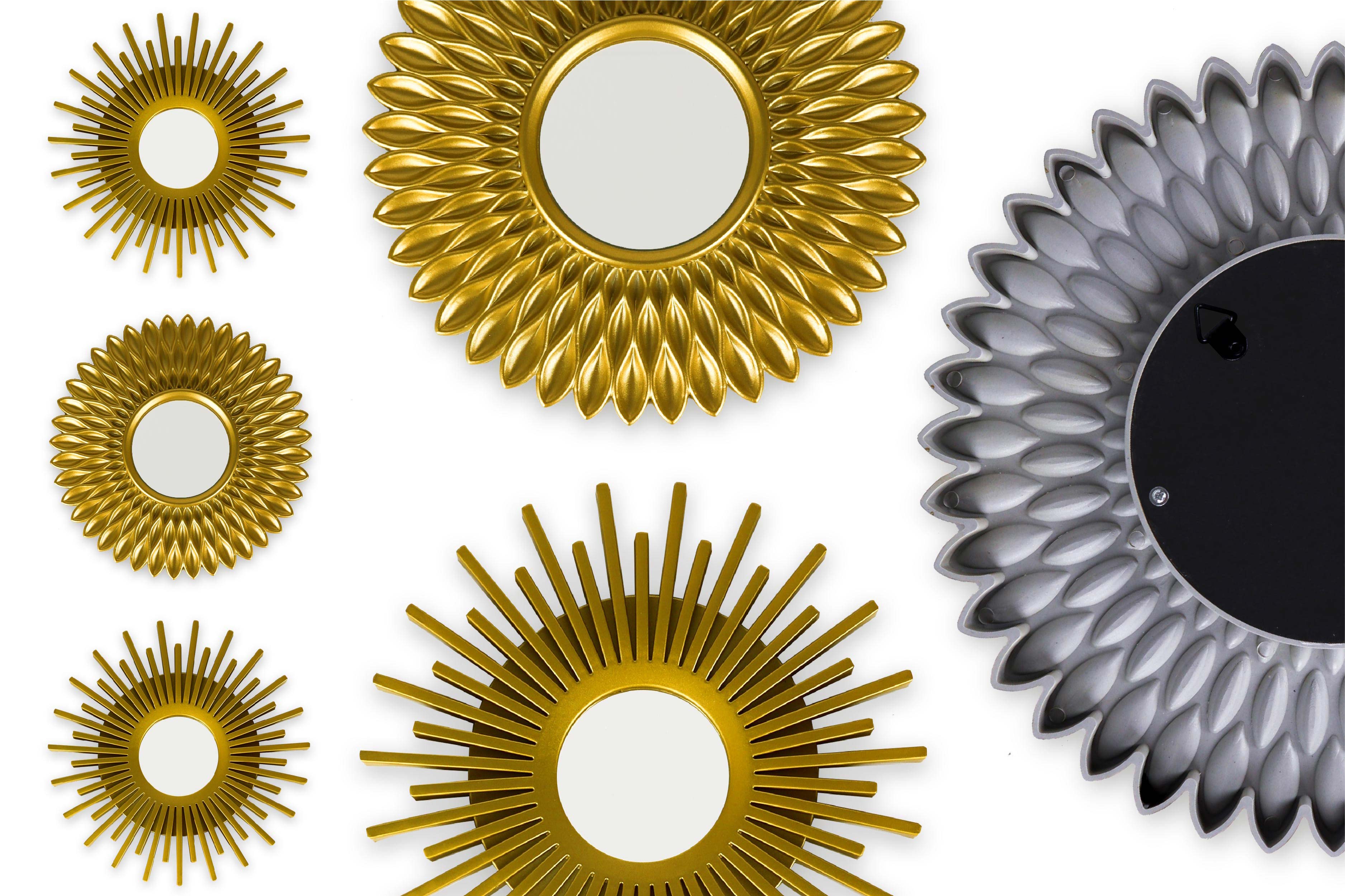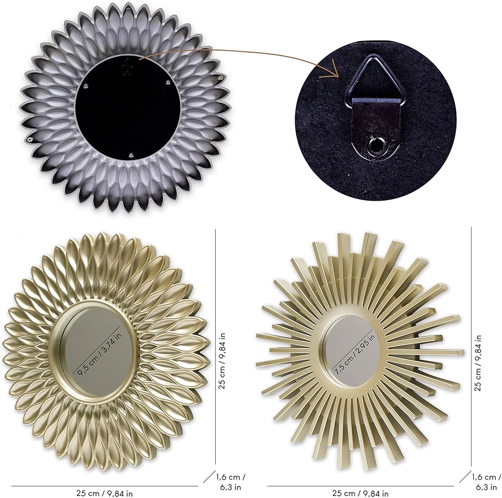 ✔ PACK OF 3 GOLD MIRRORS 25x25x1.5cm - Come with 2 different types of mirrors, both are round. In addition, on the back, they have a small eye bolt so that they can be hung on the wall.