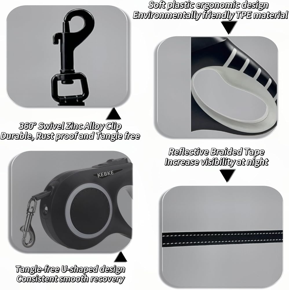 🐾【نظام فرامل خالٍ من التشابك】: ميزة القفل السريع والإيقاف المؤقت وفتح القفل، يضمن مشبك سبائك الزنك اتصالاً آمنًا، بينما يعمل الخط العاكس المصنوع من النايلون الحريري على تعزيز الرؤية أثناء النزهات الليلية. تضمن الحلقة الدائرية بزاوية 270 درجة تمديد السلك وسحبه بسهولة، بينما تعمل آلية الزنبرك ونظام الكبح الموثوقين على زيادة السلامة.