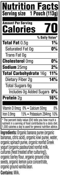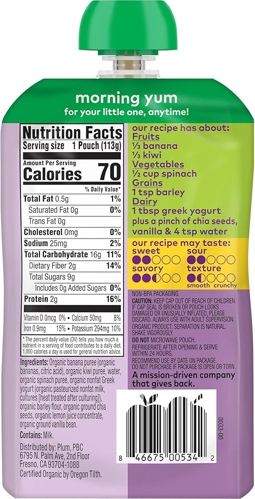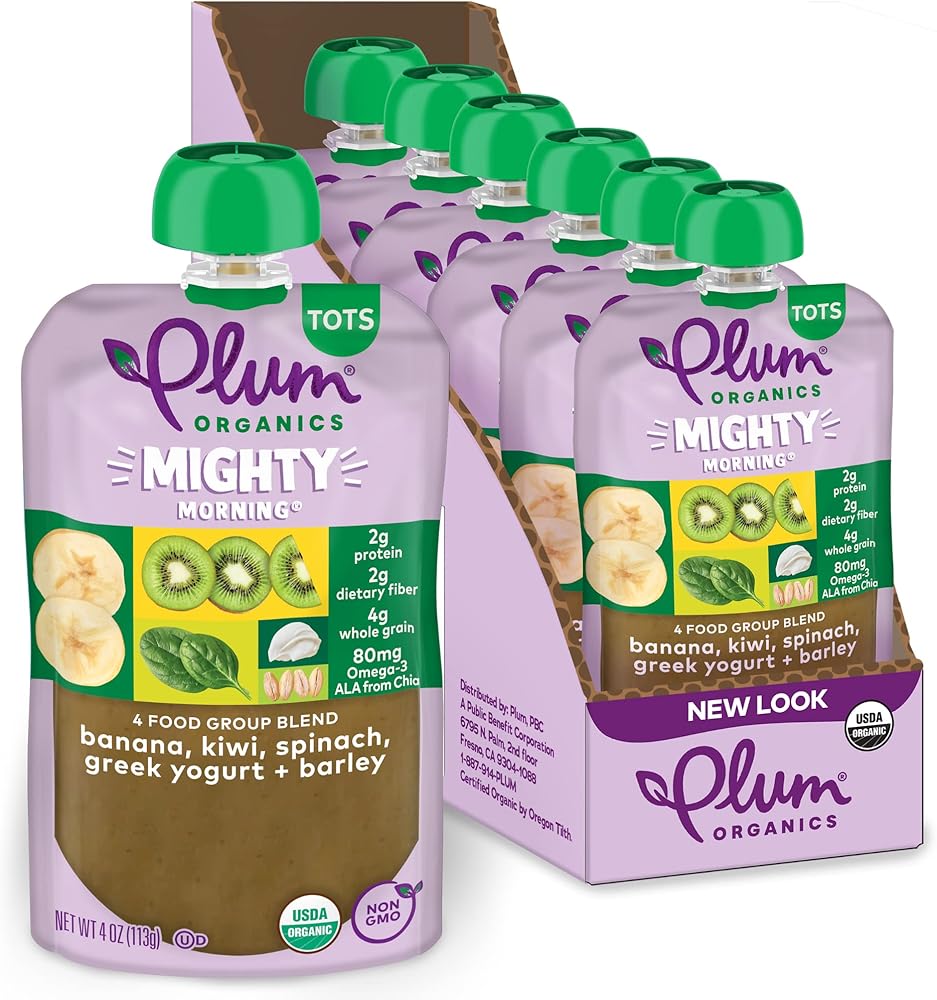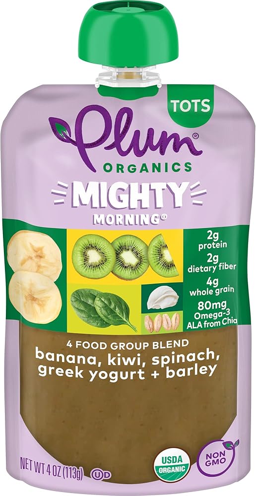 Mighty Blends for a Mighty Toddler. Plum Organics Mighty Morning Blends are filled with essential nutrients from 4 food group favorites - organic fruits, veggies, dairy, and grains - for the perfect snack to fuel your active toddler. Our Banana, Kiwi, Spinach, Greek Yogurt, and Barley blend is made with only non-GMO, organic ingredients for an organic toddler food that your toddler will love. Our Plum Organics pouches are always naturally preserved, unsalted, unsweetened, and kosher dairy. And since our baby food pouches are convenient, portable, and resealable, you can customize portion sizes, whether you're at home or you need a simple snack on the go.