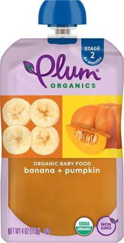 Baby Food for your Little Foodie. Plum Organics Stage 2 (6+ months) organic baby food pouches are made with blends of fruits, veggies, and ingredients that are perfect for exposing your little foodie to unique flavors, textures, and colors. Our Banana and Pumpkin blend is made with only non-GMO, organic ingredients for organic baby food that your baby will love. Plum Organics pouches are always naturally preserved, unsalted, unsweetened, and kosher parve. And since our baby food pouches are convenient, portable, and resealable, you can customize portion sizes, whether you're at home or you need a simple snack on the go.