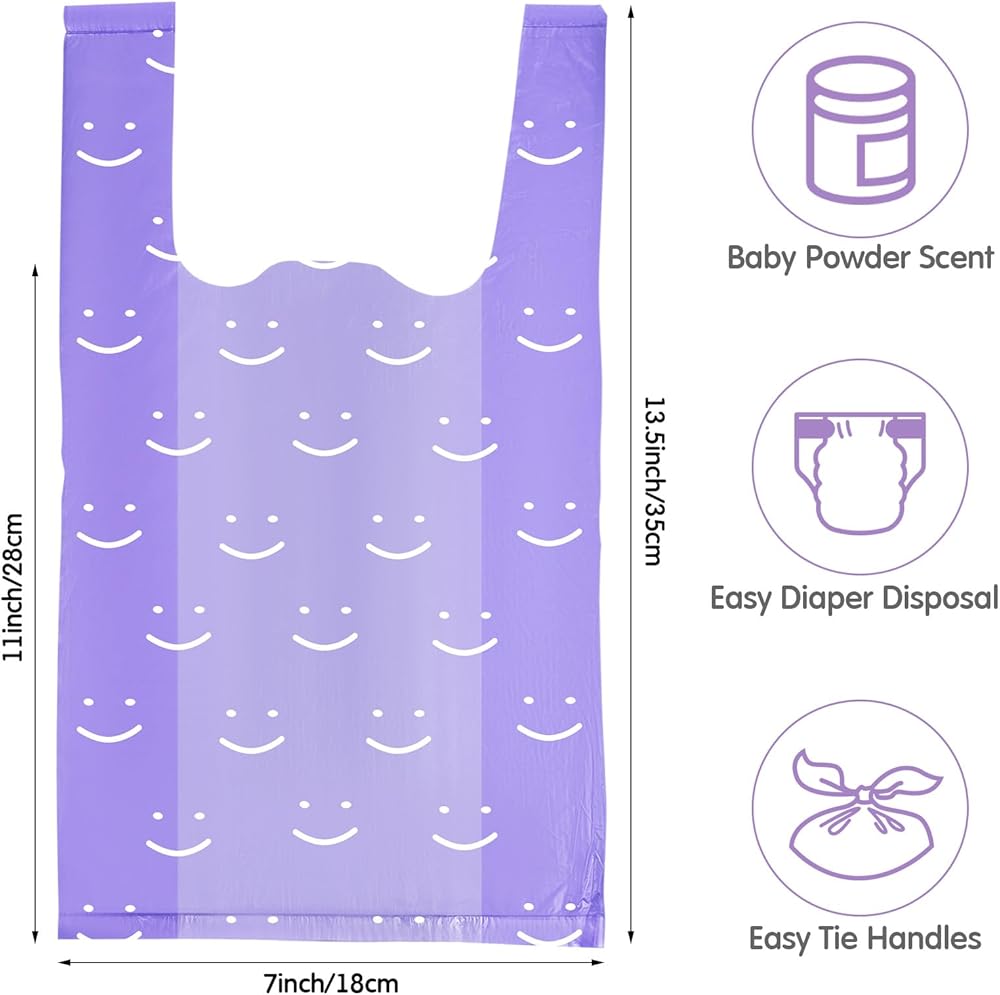 Convenient Handle Design: the size of each diaper sack is about 7 x 13.5 inches, the design with handle is more convenient for you to carry the garbage, can reduce unnecessary trouble during use and transportation, and can allow parents to pick up quick and easy cleanup for baby; Not only masks dirty diaper smell, but also protects your house and car from diaper smell