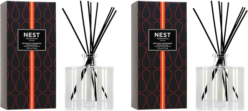 Enjoy exquisite, uninterrupted home fragrance for up to 90 days with the NEST New York Sicilian Tangerine Reed Diffuser Duo Set. Expertly crafted in the USA with the highest quality alcohol-free fragrance oils, these reed diffusers are each housed in a glass vessel adorned with elegant, frosted stripes that makes a beautiful addition to any room. Juicy Sicilian tangerine blends with bergamot, mango, and passionfruit in this sophisticated fragrance, filling any room with a mouth-watering tropical aroma. This limited edition duo set contains two oil diffusers. Each diffuser comes with eight all-natural rattan reed sticks and 5.9 fluid ounces of oil, all packaged in a unique black box. The glass vessels measure 3.75 inches wide, 4.5 inches high, and 2 inches deep. The intensity and reach of the fragrance can be customized based on the number of reed sticks used. As part of an ongoing commitment to cruelty-free practices, NEST New York has been certified by PETA, a leading organization that certifies brands that operate without animal testing. NEST New York's fragranced home, perfume, and body care collections transform the everyday by artfully blending notes of the familiar, the exotic, and the unexpected for a fragrance experience like no other. Let NEST New York scent your world.