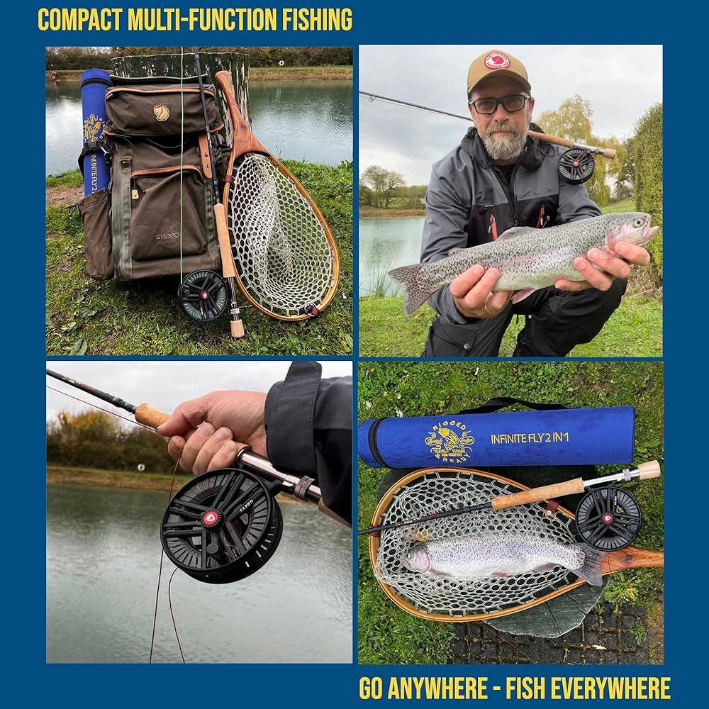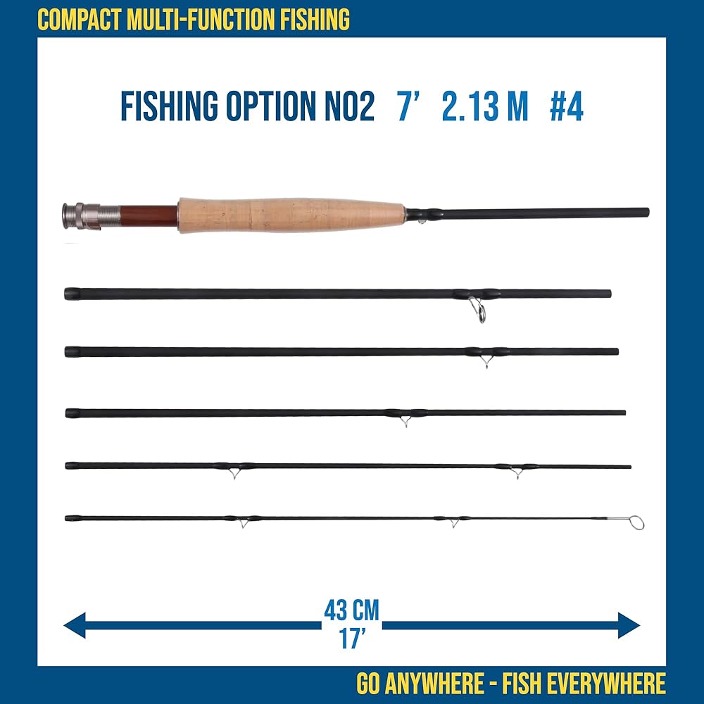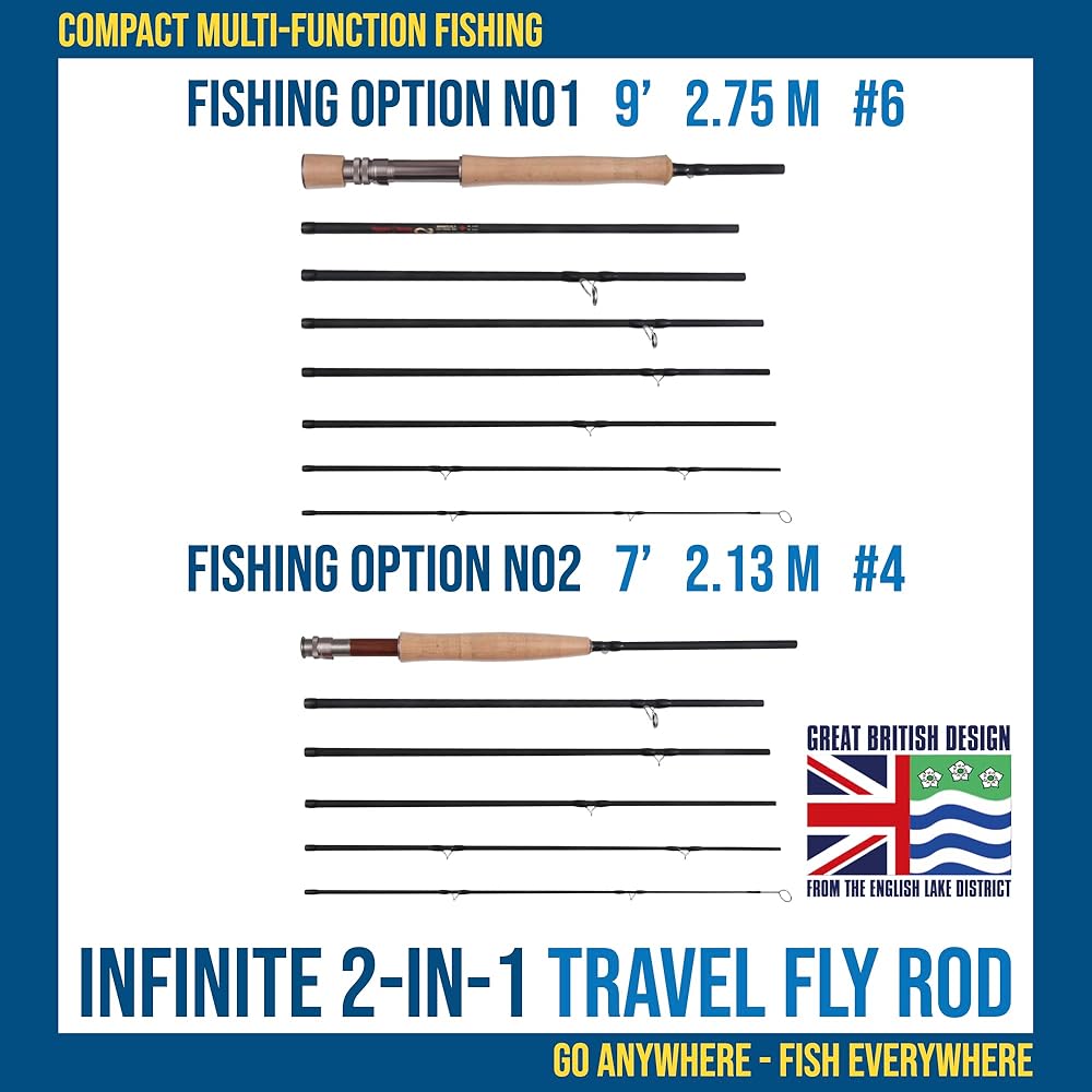 قضيبان فريدان - من أنبوب واحد. توفر صنارة الصيد انفينيت 2 في 1 للسفر كلاً من صنارة الصيد رقم 6 بطول 9 قدم و273 سم #6 وقضيب ذباب 7 قدم 213 سم #4. إنه قضيب مكون من 8 أقسام 9 قدم #6، مزود بعقب أخف إضافي، والذي عند دمجه مع الأقسام الخمسة العلوية يشكل قضيب 7 أقدام و6 أقسام.