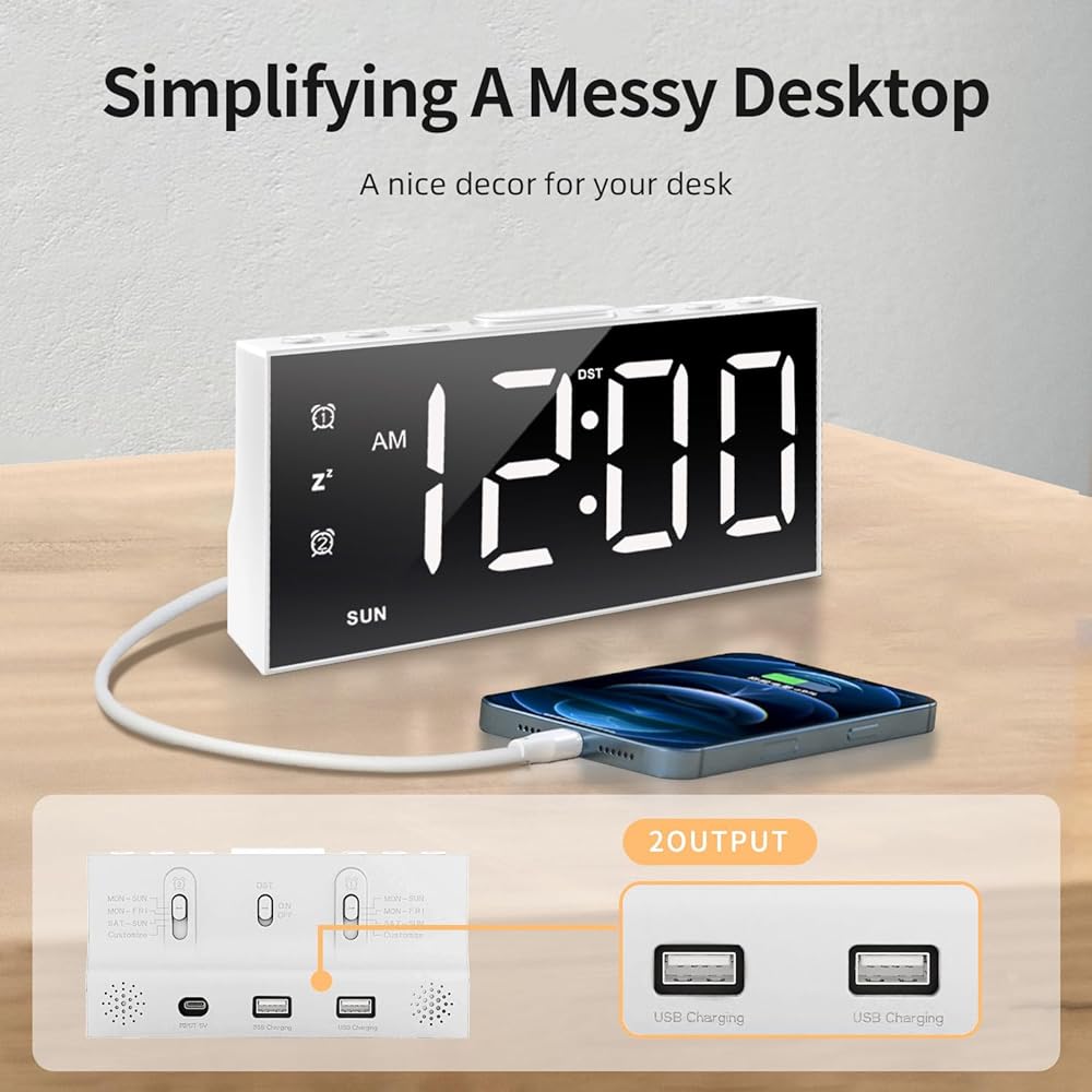 • 【شاشة كبيرة مع مفتاح تعتيم قابل للتعديل】شاشة LED واضحة كبيرة مقاس 7 انش للأرقام تضمن سهولة رؤية الوقت حتى للأشخاص ضعاف الرؤية. يتيح لك تصميم التعتيم الذكي ضبط سطوع الشاشة بـ 5 مستويات. يمكنك أيضًا اختيار لون الخط المعروض. يمكن تعديل مستوى صوت المنبه إلى 5 مستويات وفقًا لعمق نومك، وهو أعلى لمن ينامون بكثافة بينما يكون طفيفًا لمن ينامون خفيفًا. منفذ شحن يو اس بي مدمجين يسمح لك بشحن هاتفك الذكي والأجهزة الأخرى