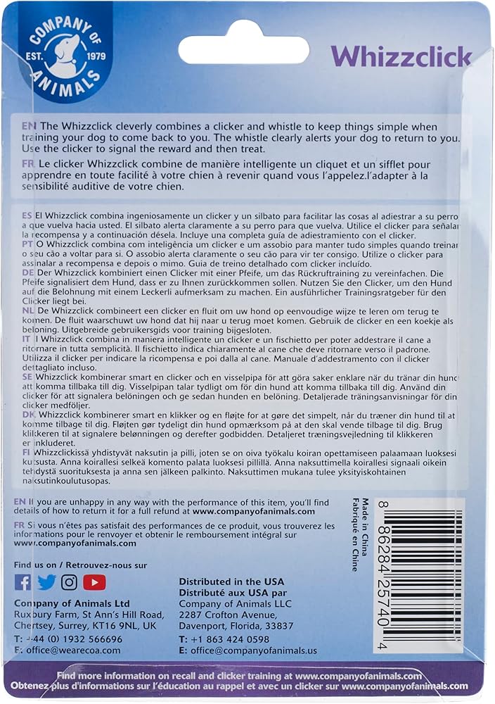 • CLICKER TRAINING: The Whizzclick clicker, has a very clear sound, it's easy and comfortable to press and use. The whistle produces a single tone that travels well in open spaces.