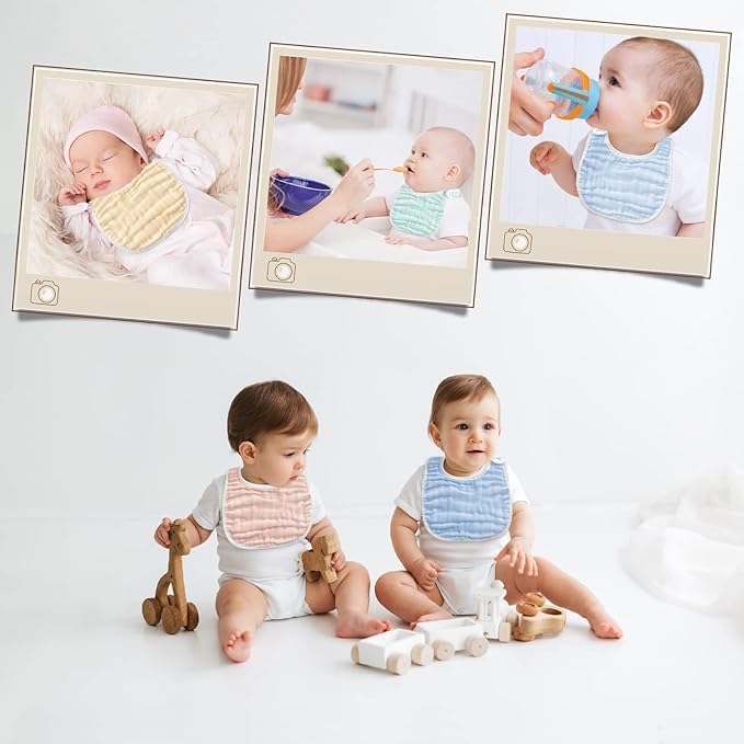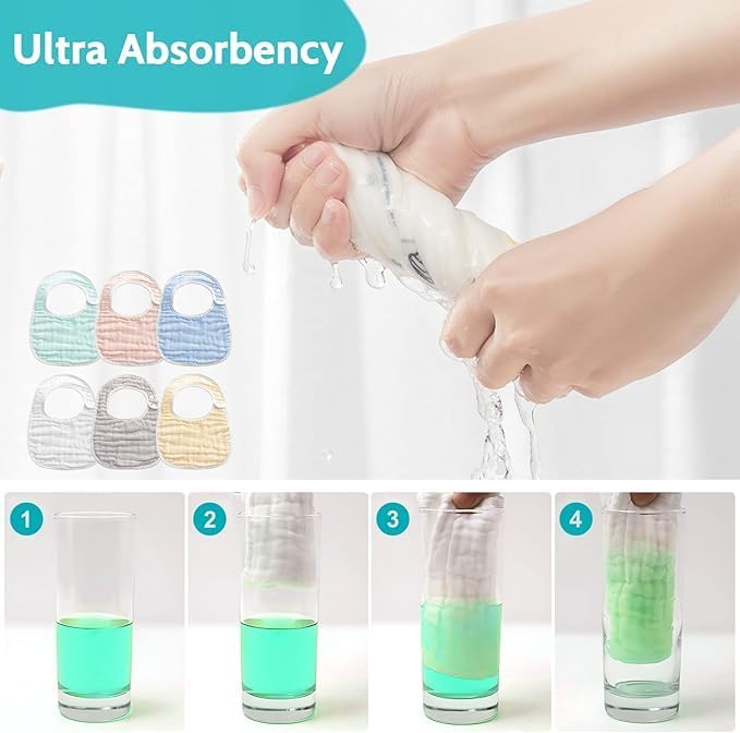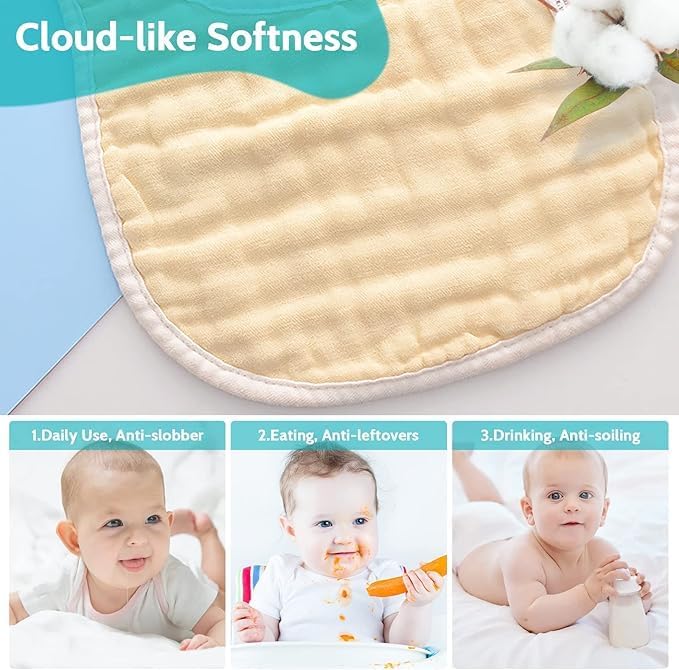 🥣【امتصاص ممتاز 8 طبقات】- تم تصميم هذه المرايل بقدرة امتصاص ممتازة لامتصاص لعاب الطفل والعرق والإفرازات الأخرى بشكل فعال، مما يحافظ على منطقة فم طفلك جافة ويقلل من الآثار الضارة للرطوبة على الجلد.