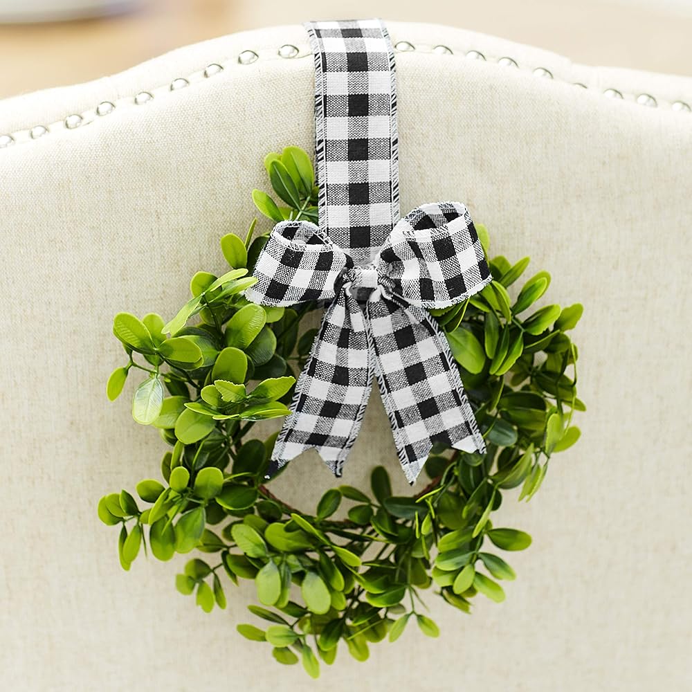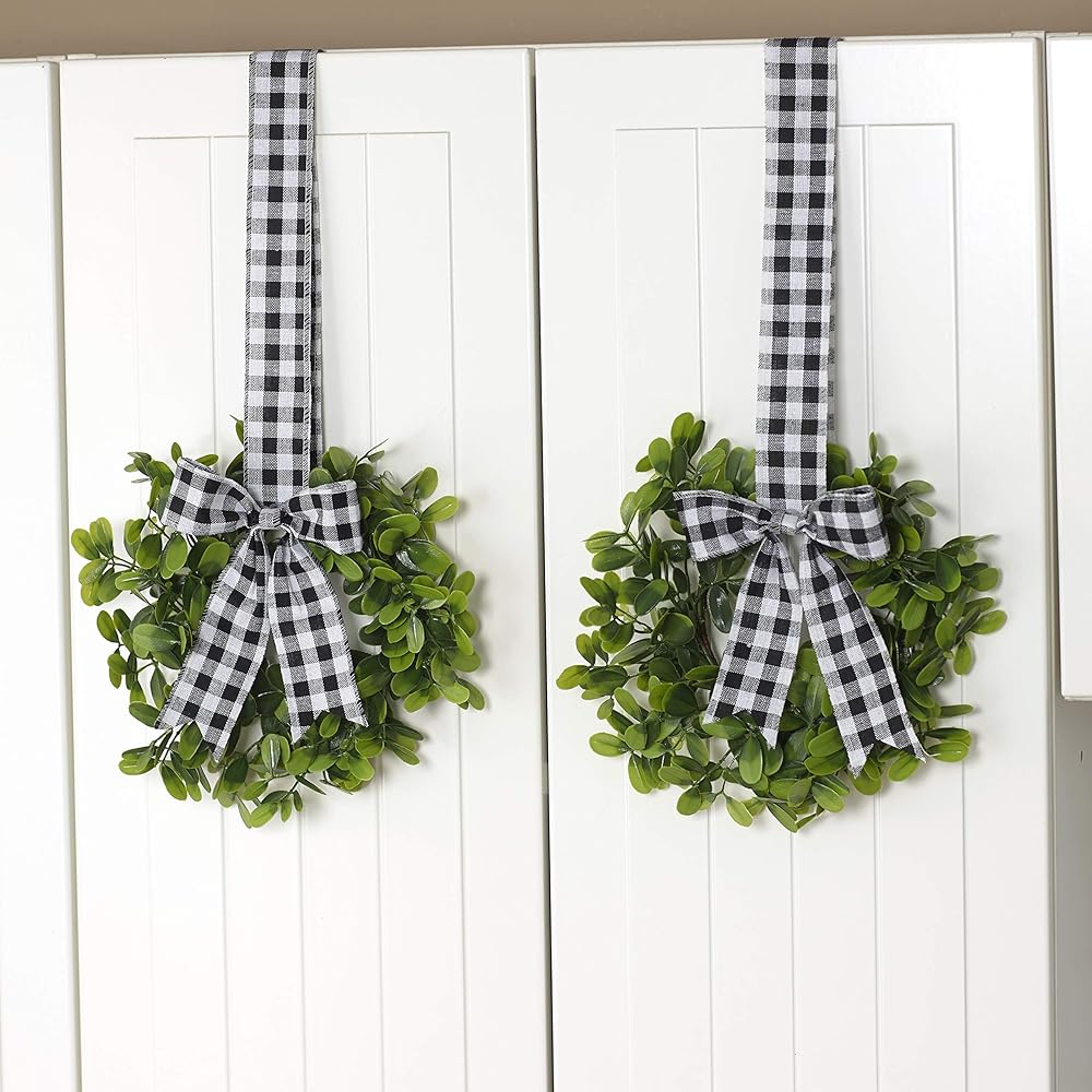 Decorate your cabinets with this Set of 2 Faux Kitchen Cabinet Wreaths. Each faux greenery wreath is trimmed with a plaid bow and a length of ribbon for hanging. Comes with the fabric-magic tape you need to hang it. Detailed Product Specifications Made from: Plastic, paper, burlap and steel Measurements: 11"W x 21"L, each