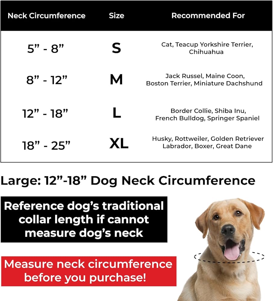 • المقاس - ننصح باتخاذ الخطوة الإضافية للتحقق مرة أخرى من محيط رقبة كلبك للتأكد من أن مخروط الكلب الناعم مناسب لكلبك. يُعد مخروط الكلاب Choola Pet Shark Attack مثاليًا لمحيط الرقبة من 12 إلى 18 بوصة. يرتبط هذا المحيط عادةً بالكلاب المتوسطة أو الكبيرة الحجم.
