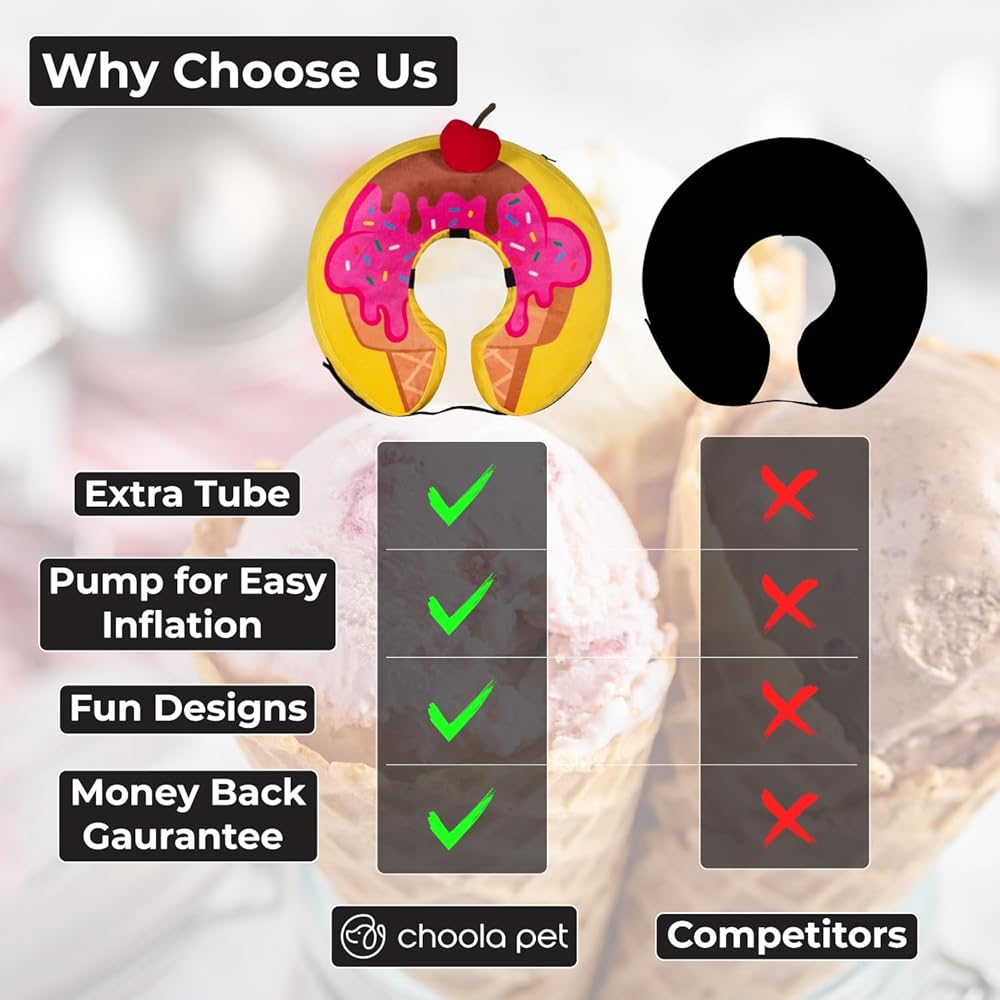 • قم بحماية كلبك...ومنزلك - يمكن لمخاريط الكلاب التقليدية الضخمة أن تلحق الضرر بأثاثك بينما يتجول كلبك حول منزلك. نشعر أيضًا بالسوء تجاه الكلاب عندما تكون محاصرة في مخروط بلاستيكي عالي الكعب. تم تصميم مخروط طوق الكلاب القابل للنفخ من Choola Pet ليكون بمثابة مخروط بديل ومريح للكلاب للعناية بعد الجراحة. يساعد مخروط الدونات الخاص بالكلب في منع عض أو لعق المنطقة المصابة أو موقع الجراحة.