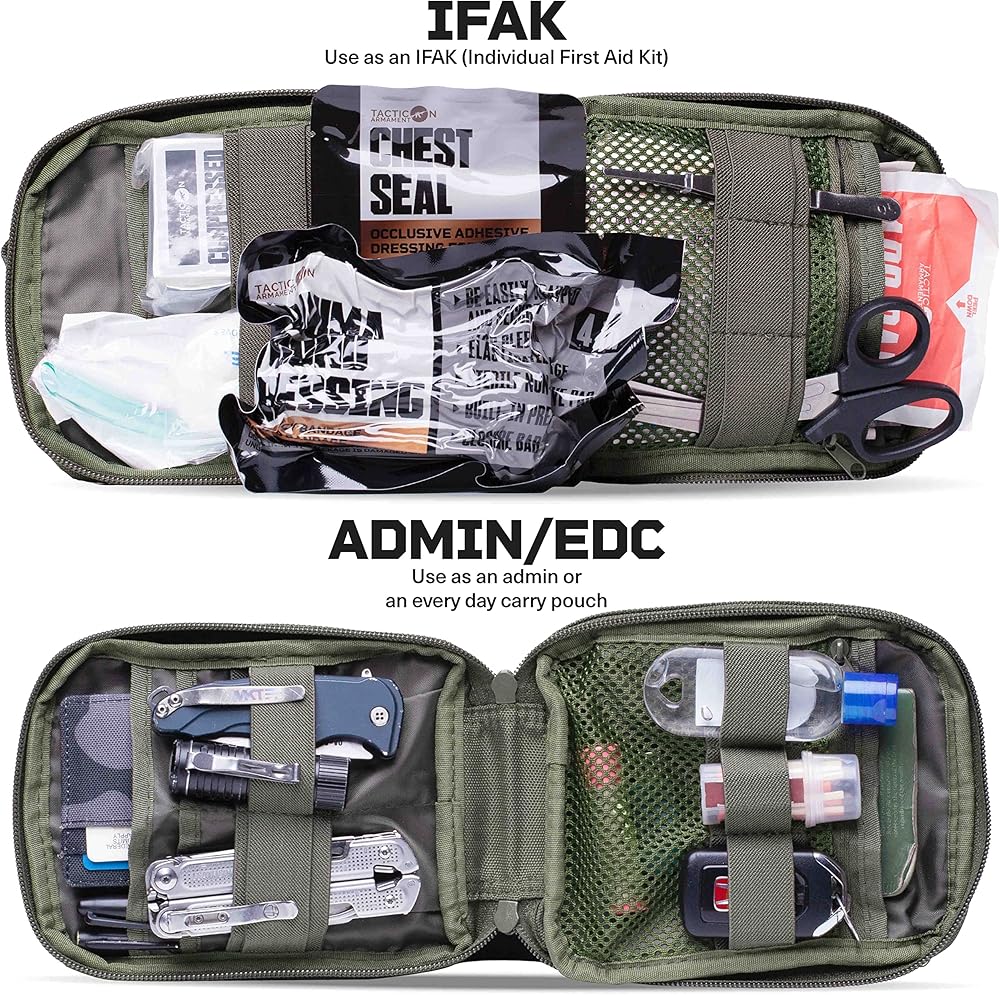✅【FIT ALMOST ANYTHING SURVIVAL / MEDICAL】 You can fit almost any ADMIN items in this bag including your phone, pens, batteries, flashlight, small notebook, multitool, rope, and much more! You can fit almost any IFAK items in this pouch including Compressed Gauze, Israeli Bandage, NPA Nasopharyngeal Airway, Full-Size Tourniquet, Chest Seals, Bandages, Tape, Tweezers, Shears, Gloves, Gauze, Splints, and much more!