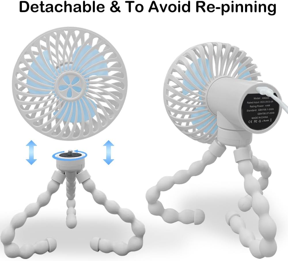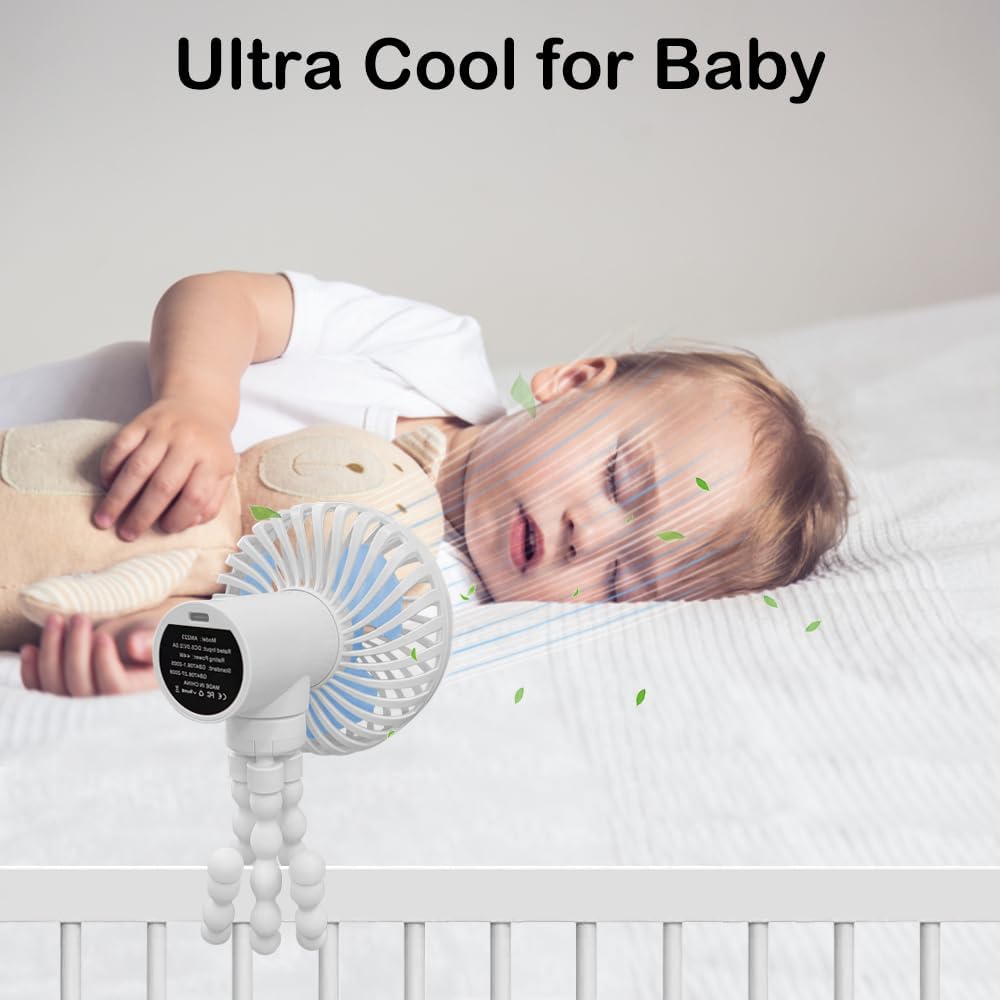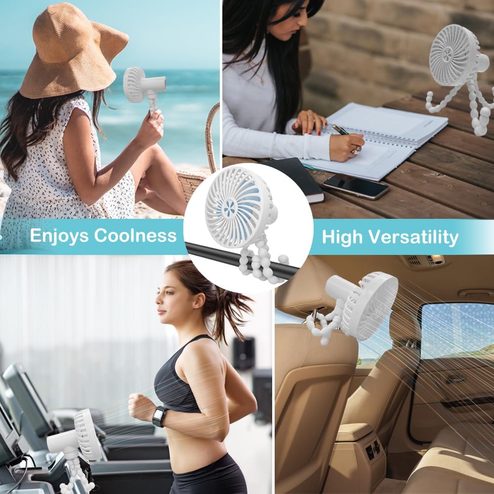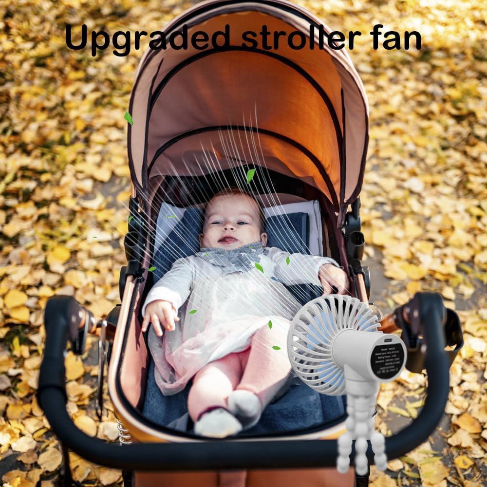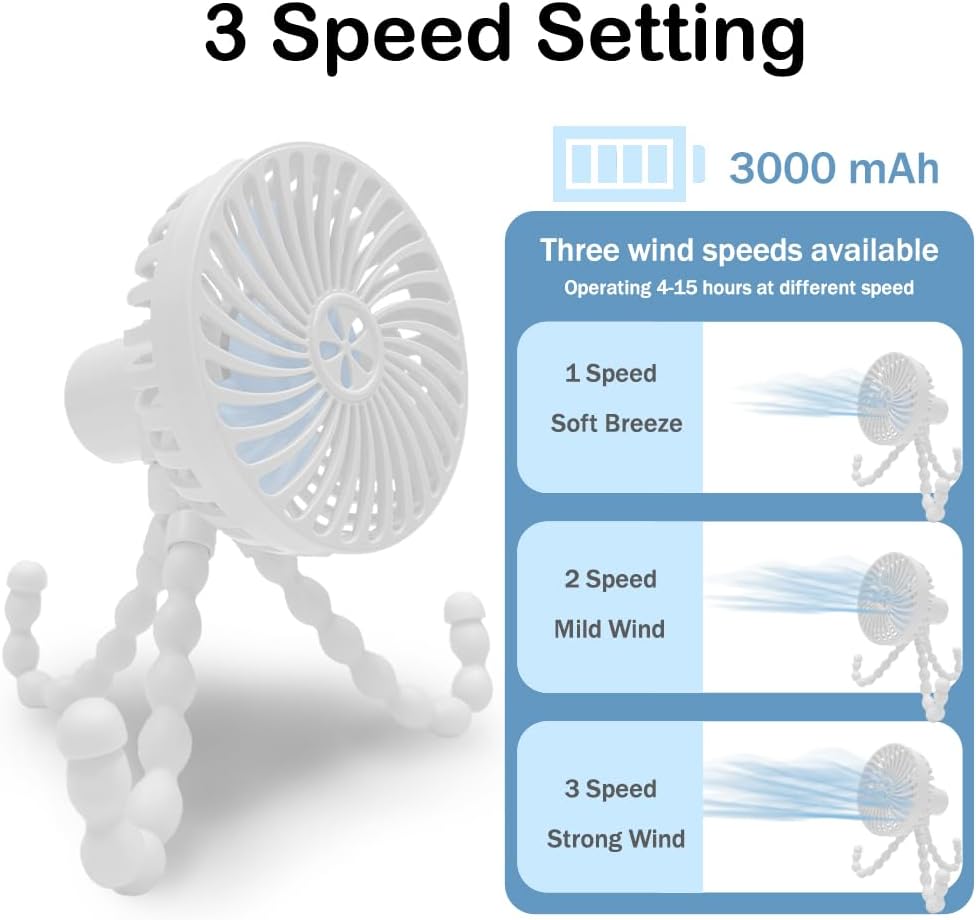 مروحة عربة الأطفال، مروحة محمولة قابلة للتعديل بـ 3 سرعات، تعمل ببطارية قابلة لإعادة الشحن عبر USB، مروحة محمولة مع حامل ثلاثي مرن، مناسبة لأسرة الأطفال وأجهزة المشي ومكاتب الطلاب والدراجات والتخييم على الشاطئ (أبيض)
