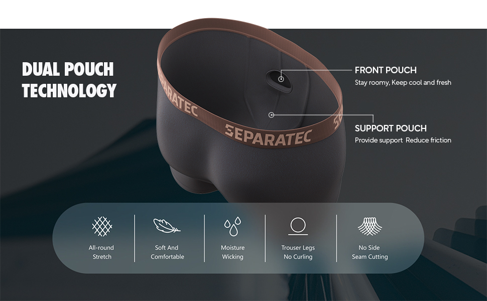 تقنية الحقيبة المزدوجة المبتكرة: توفر مساحة الحقيبة المزدوجة ثلاثية الأبعاد المحدثة تغليفًا أفضل لأجزاء الرجل الخاصة بك، وتحل المشكلات الناجمة عن القمع والإزاحة والتشويش بين الرجلين. تم تحديث تقنية الحقيبة المزدوجة للاستمتاع بإحساس الحرية، من أجل الراحة في مكانها