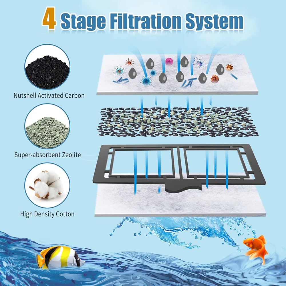 • أداء ترشيح ممتاز - خراطيش الفلتر مصنوعة من قطن عالي الكثافة + كربون نشط أكثر بنسبة 50% + زيوليت، والذي له تأثير ترشيح من 4 طبقات لتصفية وامتصاص 99% من الشوائب، خاصة امتصاص الأمونيا والنيتروجين في الماء. وذلك للحفاظ على نظافة مصدر المياه والنمو الصحي للأسماك.