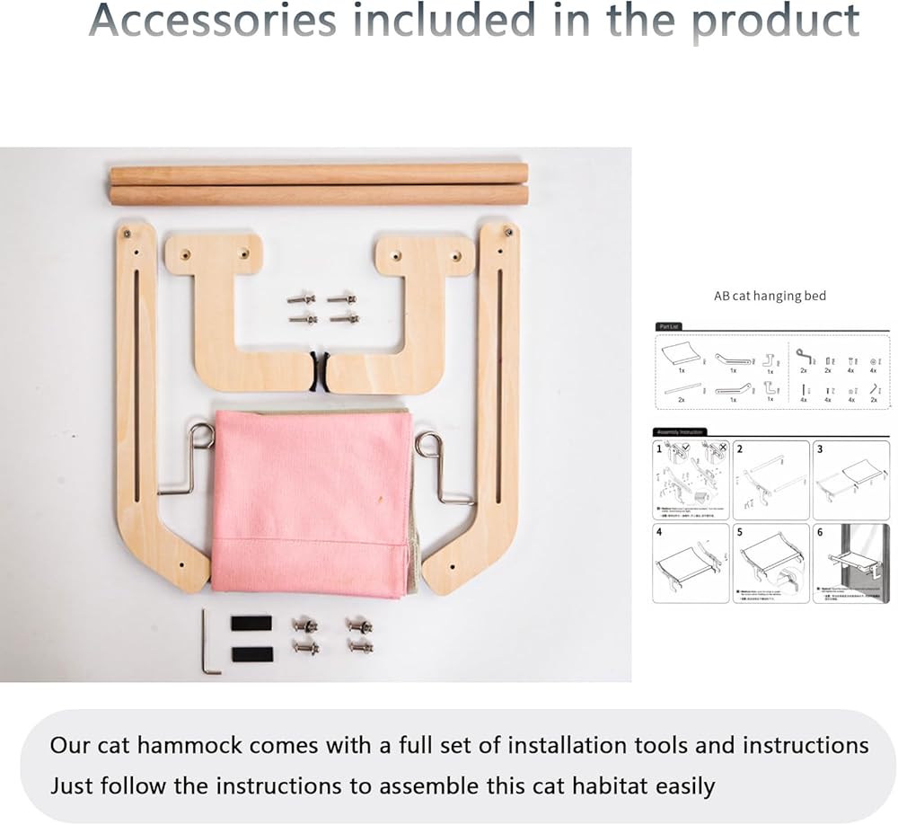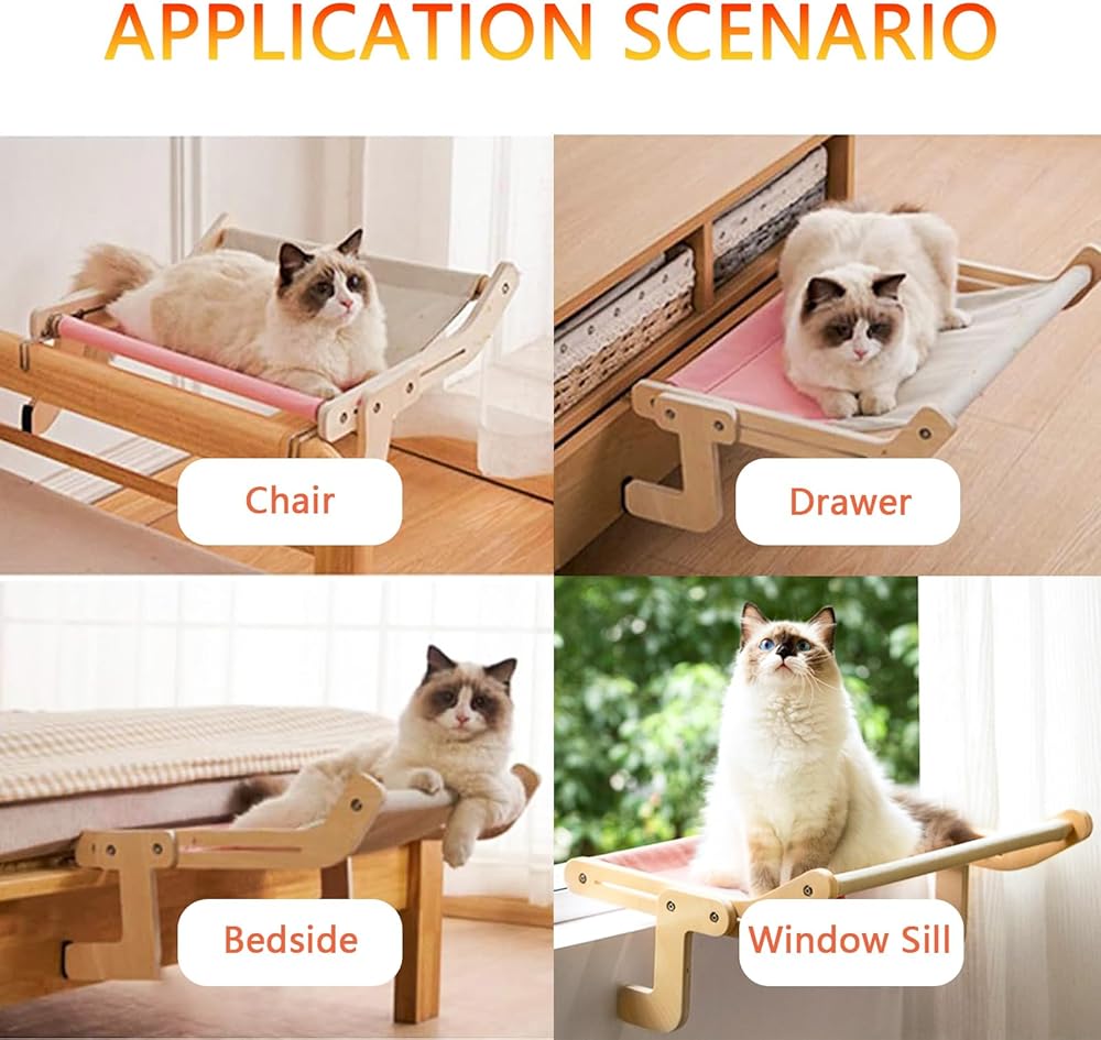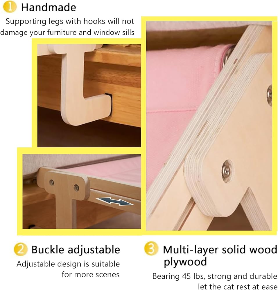【لا حاجة إلى حفر ثقوب أثناء التثبيت لحماية الجدار】تم تثبيت أرجوحة القطط هذه بخطافين معدنيين ومدعومة بدعامتين خشبيتين سميكتين. توجد وسائد ناعمة بالأسفل، والتي تحمي الجدار بشكل أفضل دون إتلافه. بالإضافة إلى ذلك، لا يحتوي سرير القطط على أكواب شفط، لذلك لا داعي للقلق بشأن سقوطها أو تقدم السن. تعمل الخطافات المعدنية الموسعة على زيادة منطقة التلامس لعتبة النافذة لحمايتها بشكل أفضل