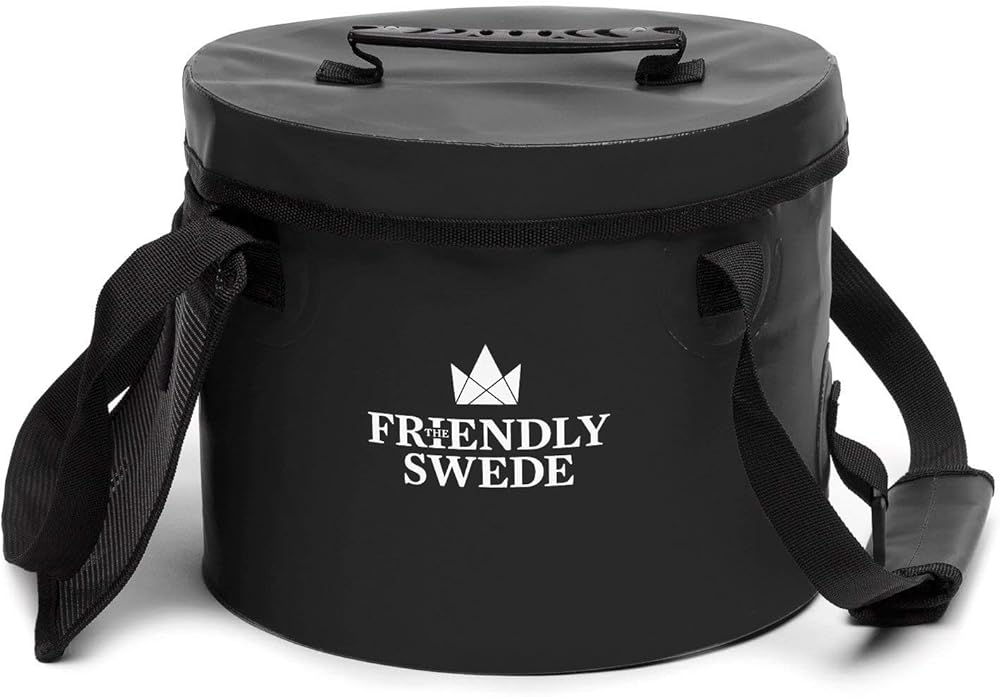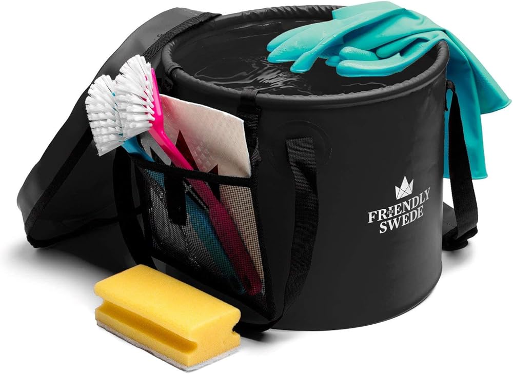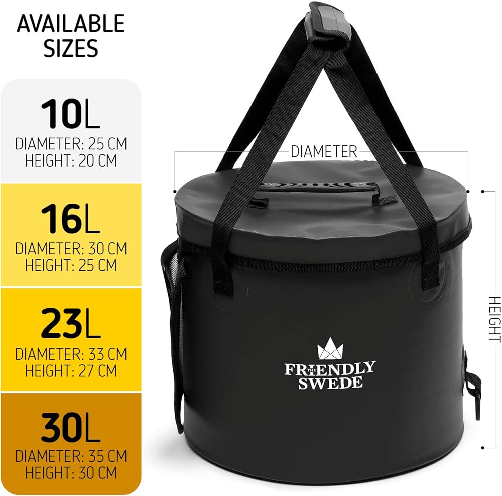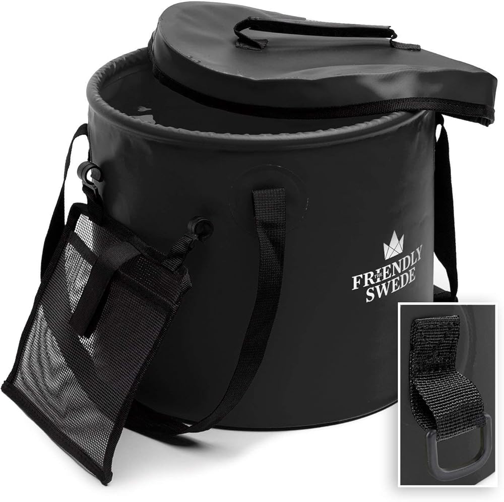 دلو سويدي صديق قابل للطي مع غطاء، دلو قابل للطي للتخييم والسفر والبستنة، دلو مياه محمول مع جيب شبكي لأدوات يدوية، حاوية مياه قابلة للطي، حاوية مياه للتخييم