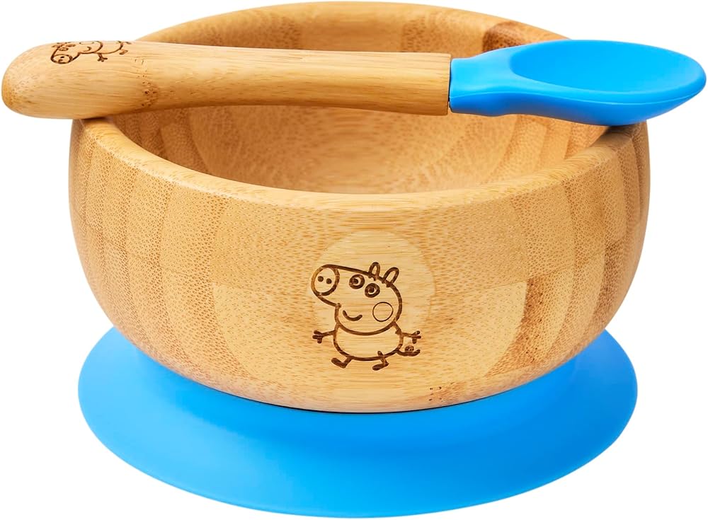 Worried about mischief at mealtime? Our cheeky Peppa Pig bowl is sure to withstand inquisitive fingers thanks to its high-power suction base. Bamboo spoon with silicone tip is carefully crafted to help young ones devour their food easily.