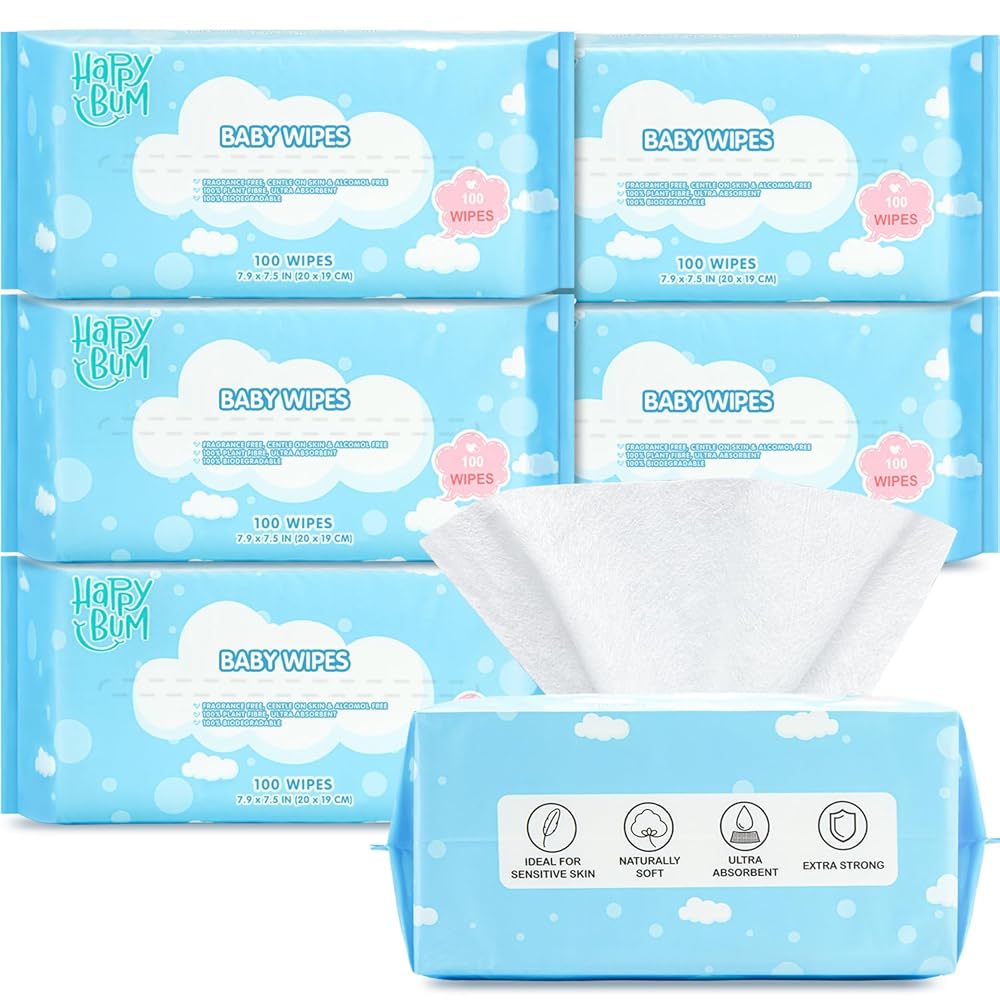 مناديل مبللة للأطفال الجافة من هابي بوم، للبشرة الحساسة، مناديل سفر ناعمة غير معطرة لأيدي الوجه حديثي الولادة، 6 عبوات (600 قطعة)