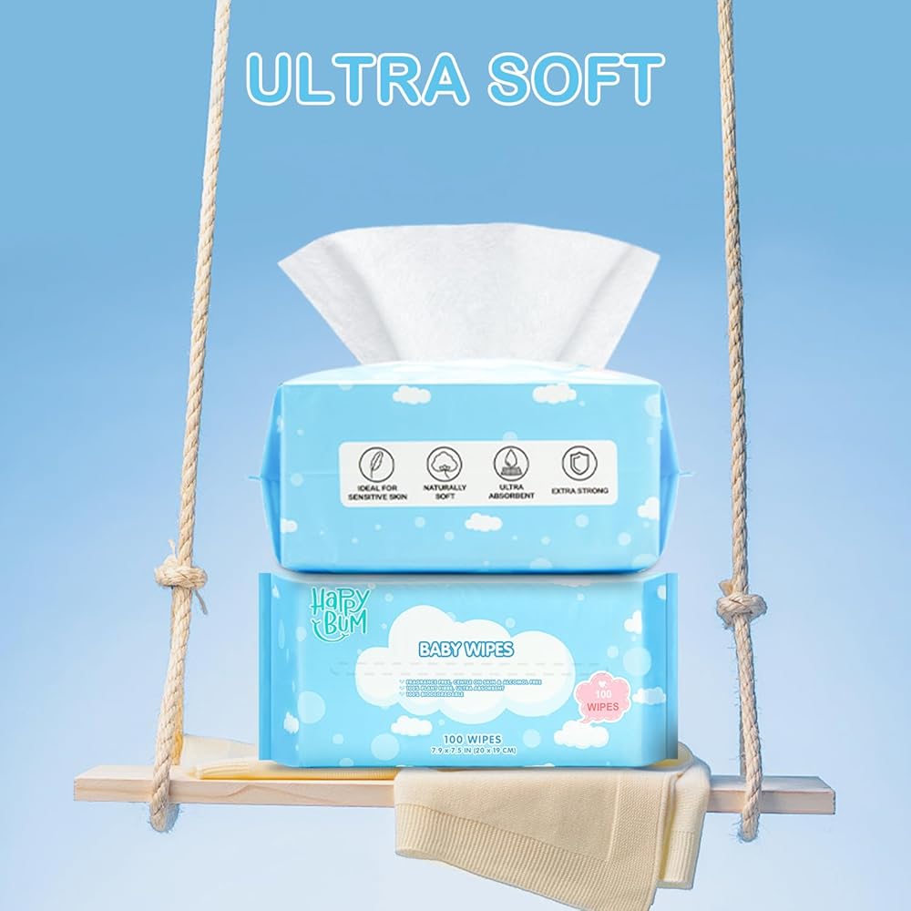 - مناديل HAPPY BUM للاستخدام الجاف والرطب، وببساطة مبللة بالماء الدافئ لتنظيف ناعم ومريح