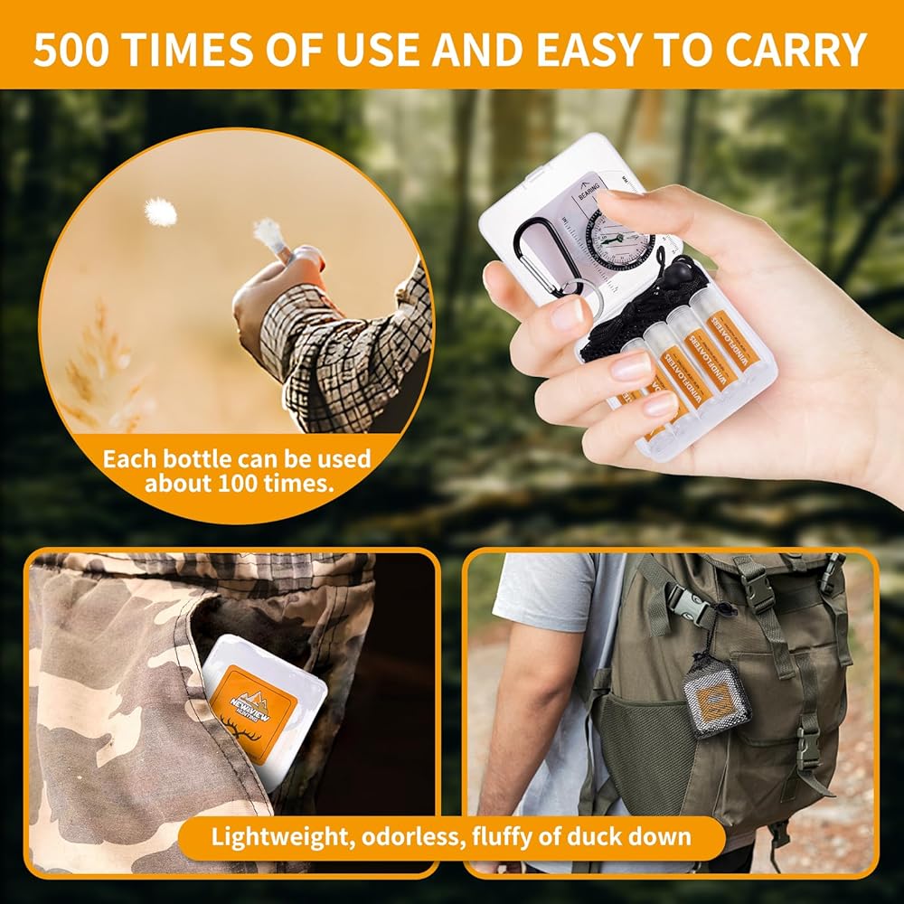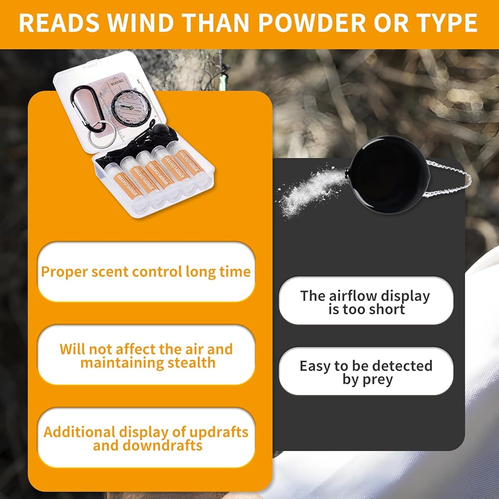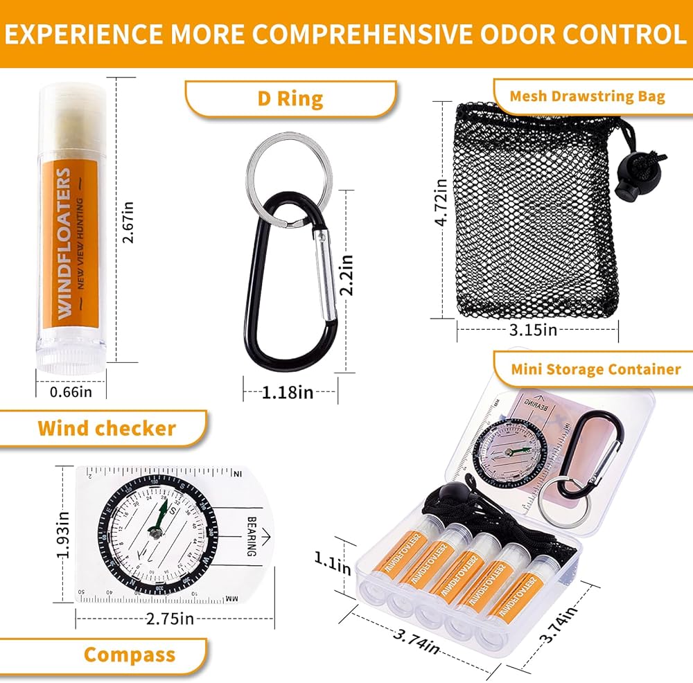 Windfloaters For Hunters - You will receive our set: 5 bottles of hunting wind checker, a climbing D ring, a compass, a mini storage containers and a mesh drawstring bag. The tubular design of the deer hunting wind detector has a diameter of 0.66 inches and a high of 2.67 inch. Our Detects Subtle Breezes set can help you adapt to more complex environments and needs. Experience the next level of scent control