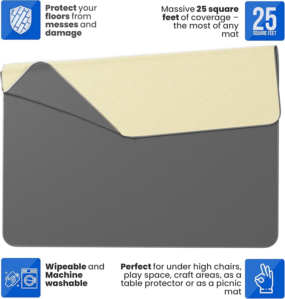 • Make mealtime or craft time clean-up a breeze: Whether it's a cup full of grapes, a plate full of saucy spaghetti, or drips of paint, our extra large splat mat can catch anything you throw at it. This durable baby splat mat can easily packed in your diaper bag which makes it great for moms on the go or as a portable drop cloth and high chair mat.
