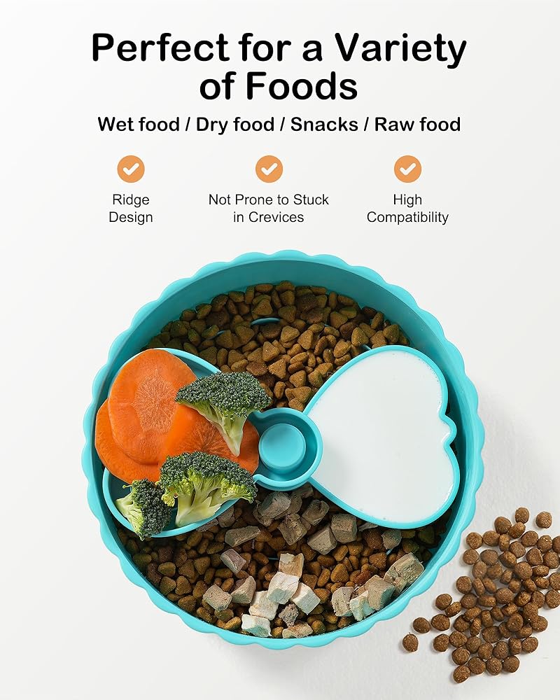 توافق الطعام متعدد الاستخدامات: يمكن لوحدة التغذية البطيئة أن تحتوي على مجموعة متنوعة من أنواع الطعام، بما في ذلك الأطعمة الجافة والأطعمة المعلبة والأطعمة الرطبة والأطعمة الخام. توفر الأجزاء الدوارة العلوية المصممة بعناية مكانًا مثاليًا للطعام الخام والرطب، مما يساعدك على الحفاظ على تناول غذائي متوازن جيدًا لكلبك. بغض النظر عن تفضيلاتك الغذائية، فقد تم تصميم وحدة التغذية البطيئة للكلاب لدينا لتلبية احتياجاتك بشكل مثالي