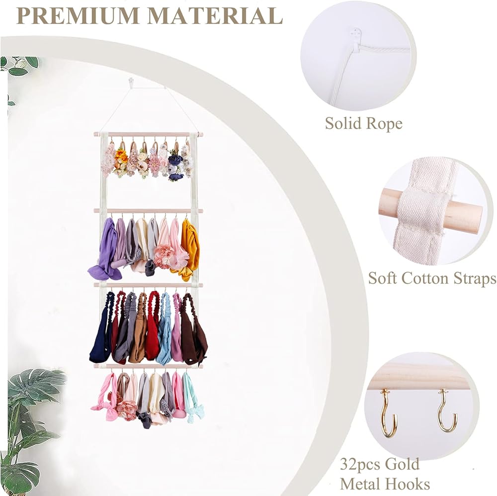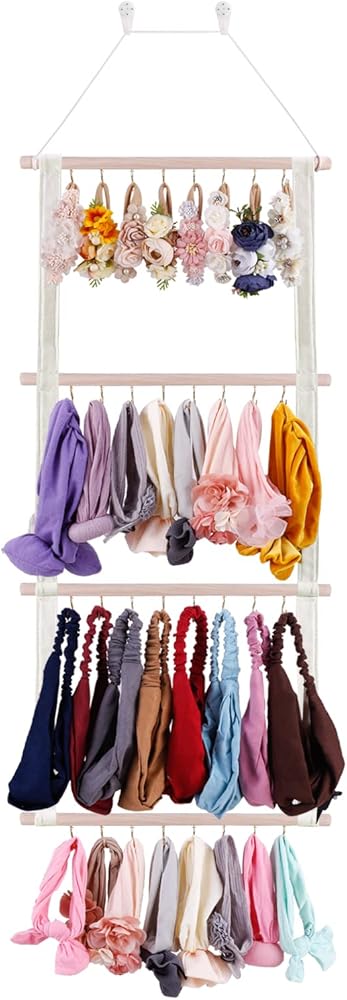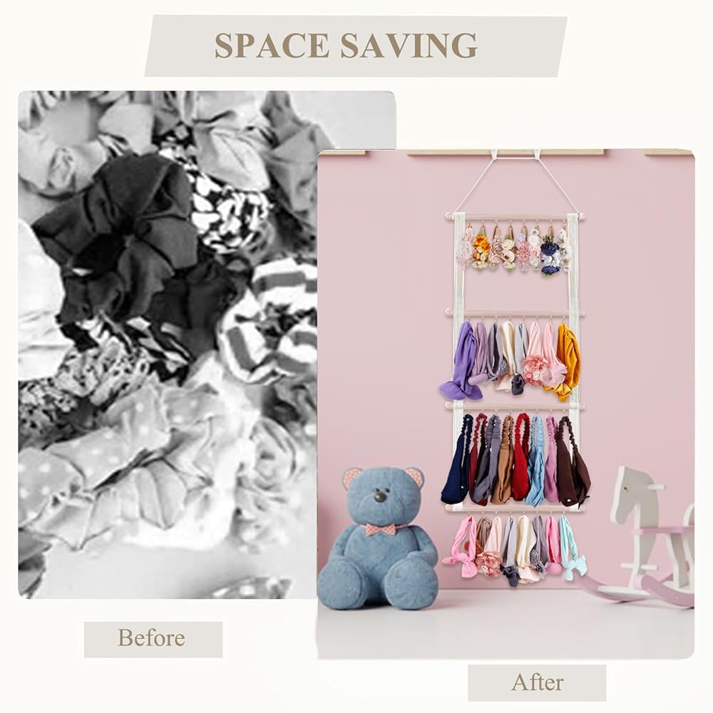 • توفير المساحة - مقاس 99.56 سم طولًا × 38.1 سم عرضًا، يمكن لحامل قوس الشعر الخاص بنا للفتيات مع 32 خطافًا حمل ما يصل إلى 60 مشبك شعر و32-64 قطعة من عصابات الرأس بأحجام مختلفة. قم بتنظيم جميع إكسسوارات شعر الطفل في مكان واحد سهل.