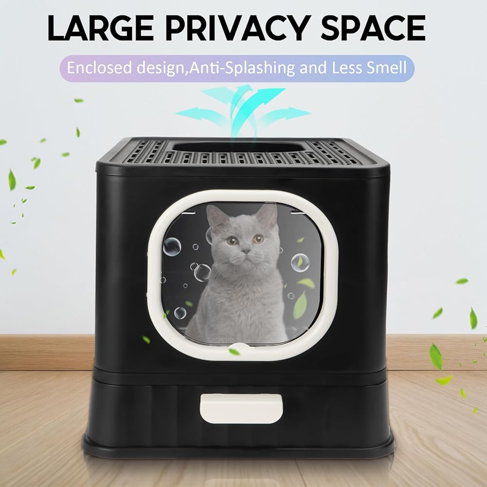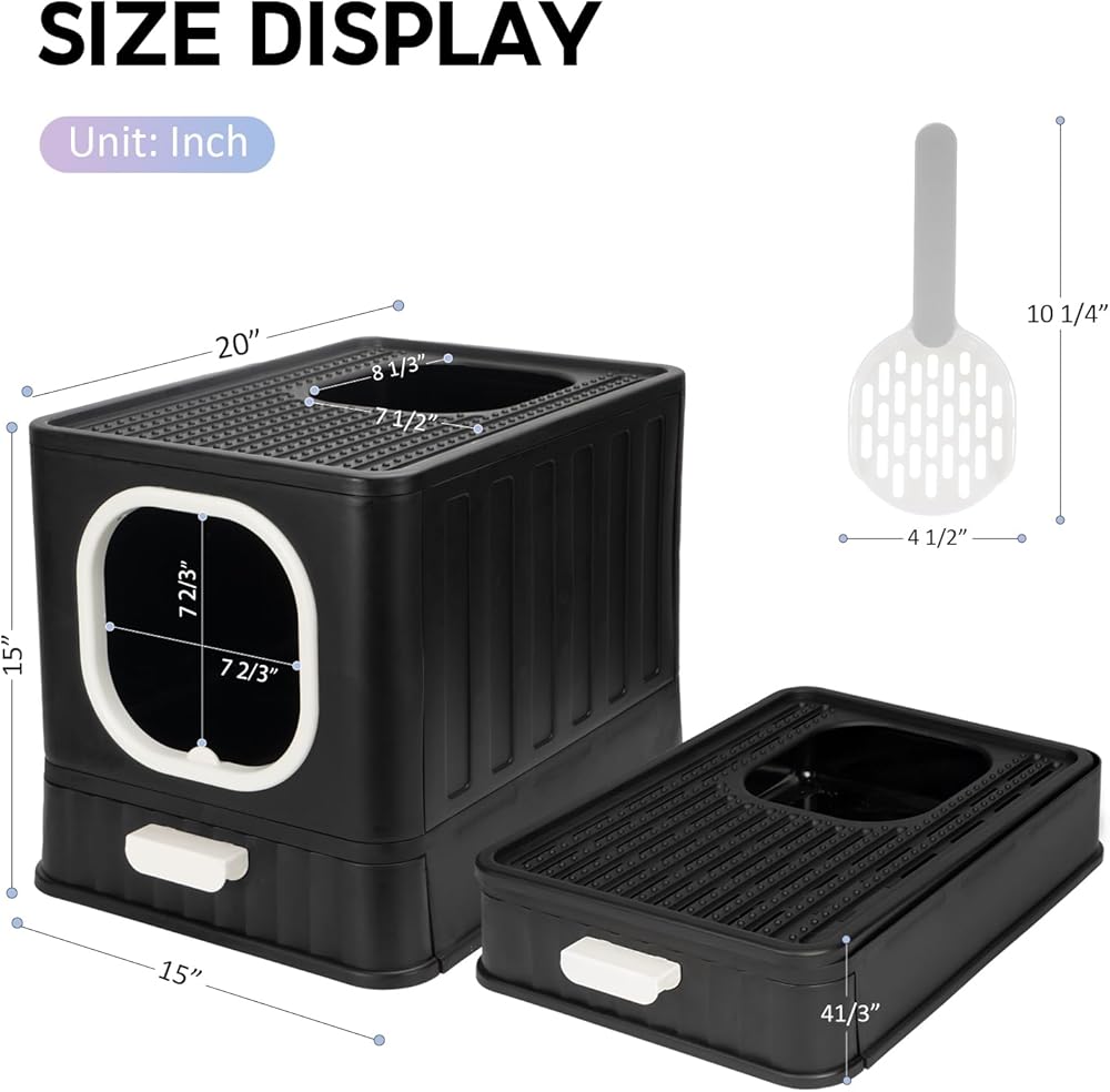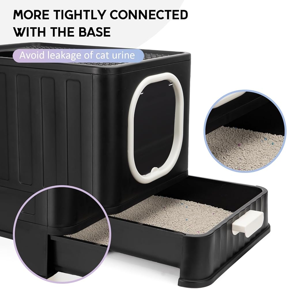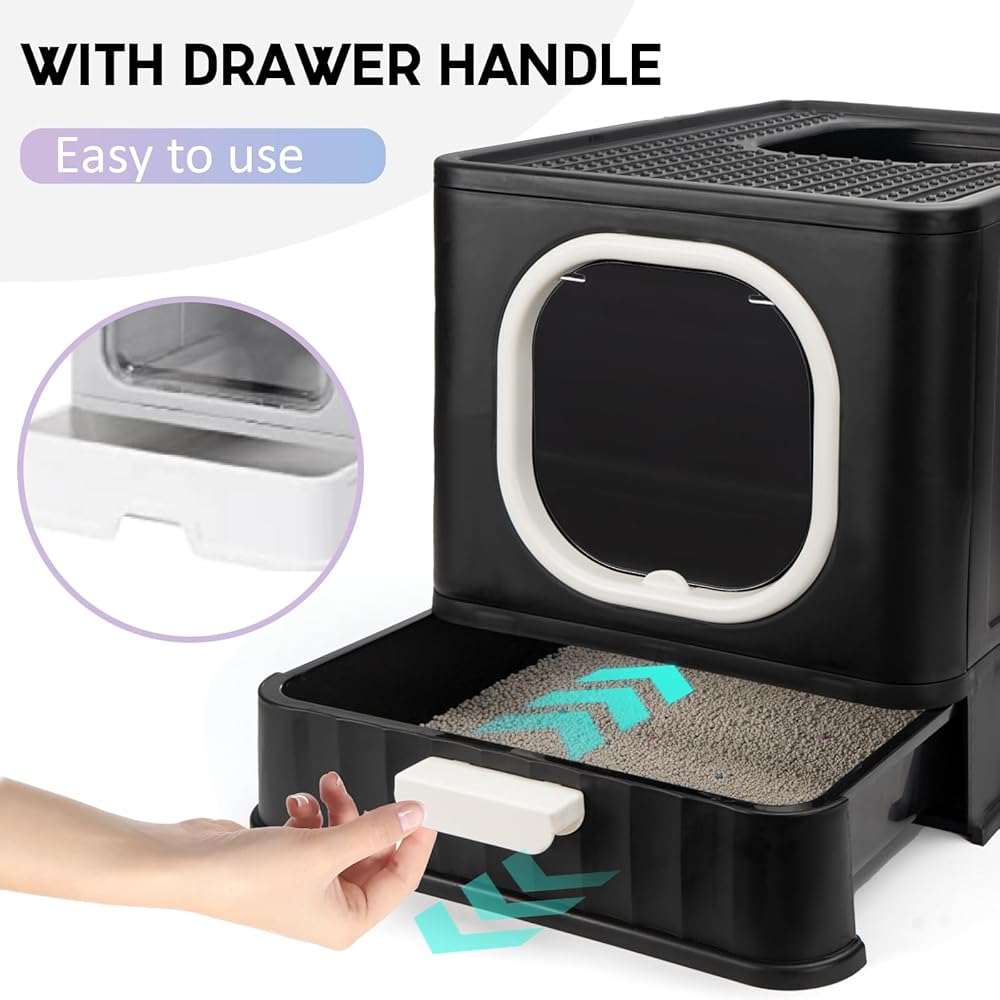 صندوق فضلات القطط قابل للطي مع غطاء، وعاء فضلات القطط كيتي مغلق بالكامل ومضاد للتناثر مع مقبض، نونية كبيرة للقطط، مدخل أمامي، مخرج علوي، مرحاض القطط من نوع الدرج، سهل التنظيف بمغرفة فضلات القطط الأنيقة