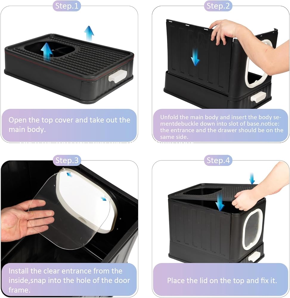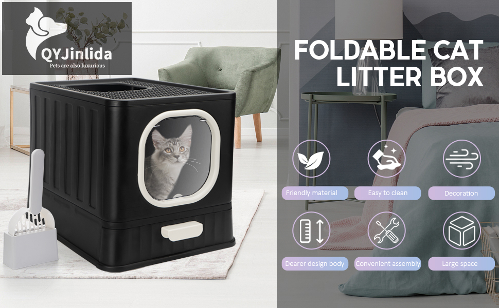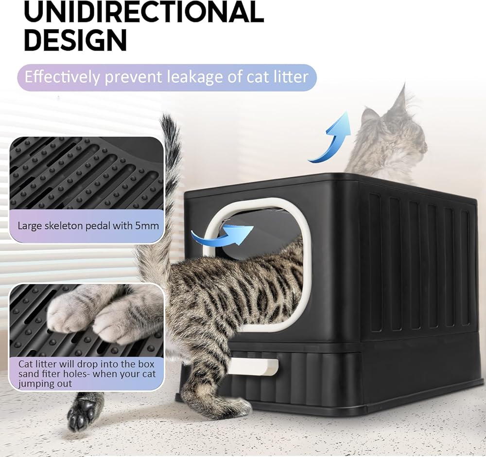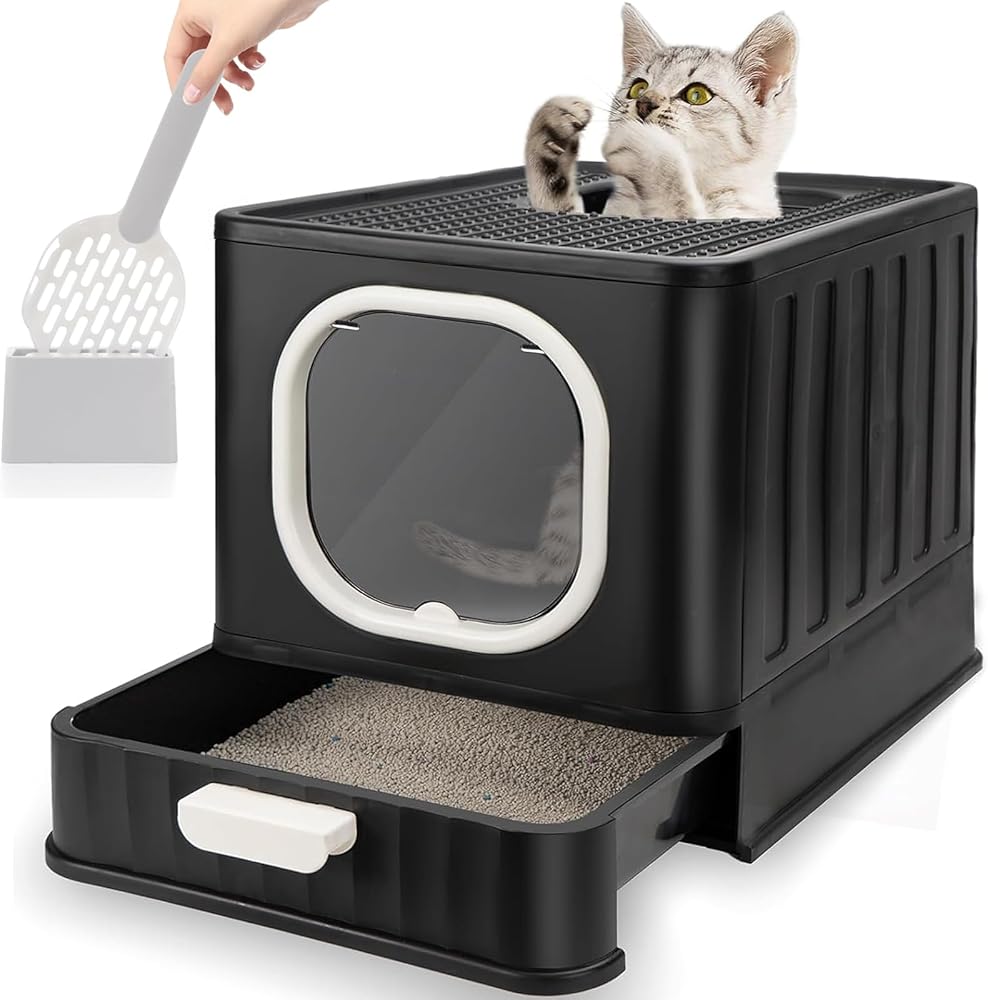 صندوق فضلات القطط قابل للطي مع غطاء، وعاء فضلات القطط كيتي مغلق بالكامل ومضاد للتناثر مع مقبض، نونية كبيرة للقطط، مدخل أمامي، مخرج علوي، مرحاض القطط من نوع الدرج، سهل التنظيف بمغرفة فضلات القطط الأنيقة