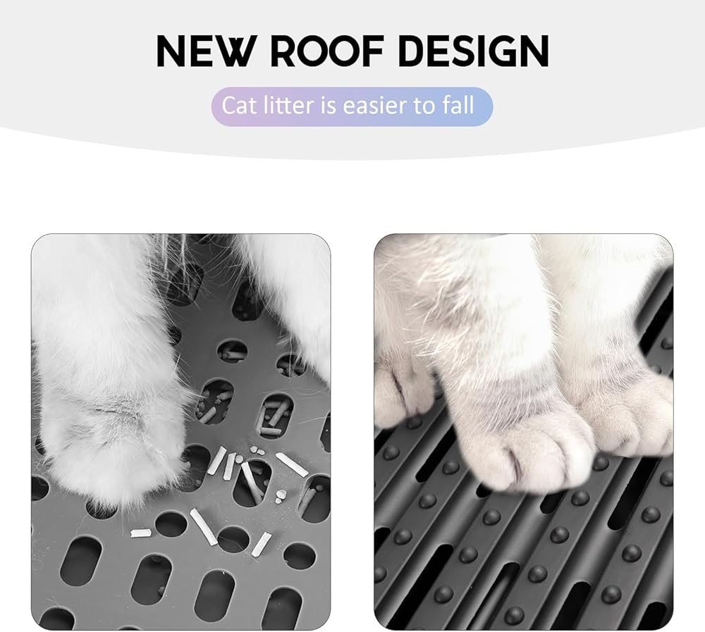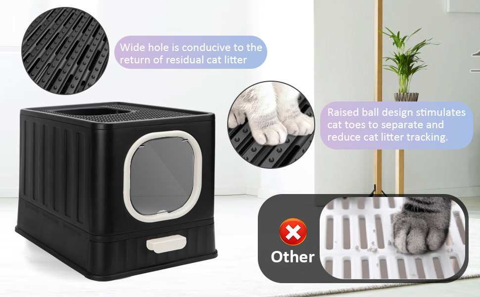• 🐾[يمنع تسرب الرائحة والقمامة] - صندوق فضلات القطط بتصميم أحادي الاتجاه لمنع الروائح وتناثر فضلات القطط. الدخول الأمامي والخروج العلوي يجعل القطة لا تستطيع الخروج من الباب الأمامي، ولكن يمكنها الدخول والخروج من الأعلى. يعمل العدد الكبير من فتحات الفلتر مقاس 5 ملم في الجزء العلوي على تصفية الفضلات أثناء دخول القطة وخروجها من الأعلى، بينما تقوم بتدريب قطتك على القفز بشكل طبيعي من أجل صحة أفضل