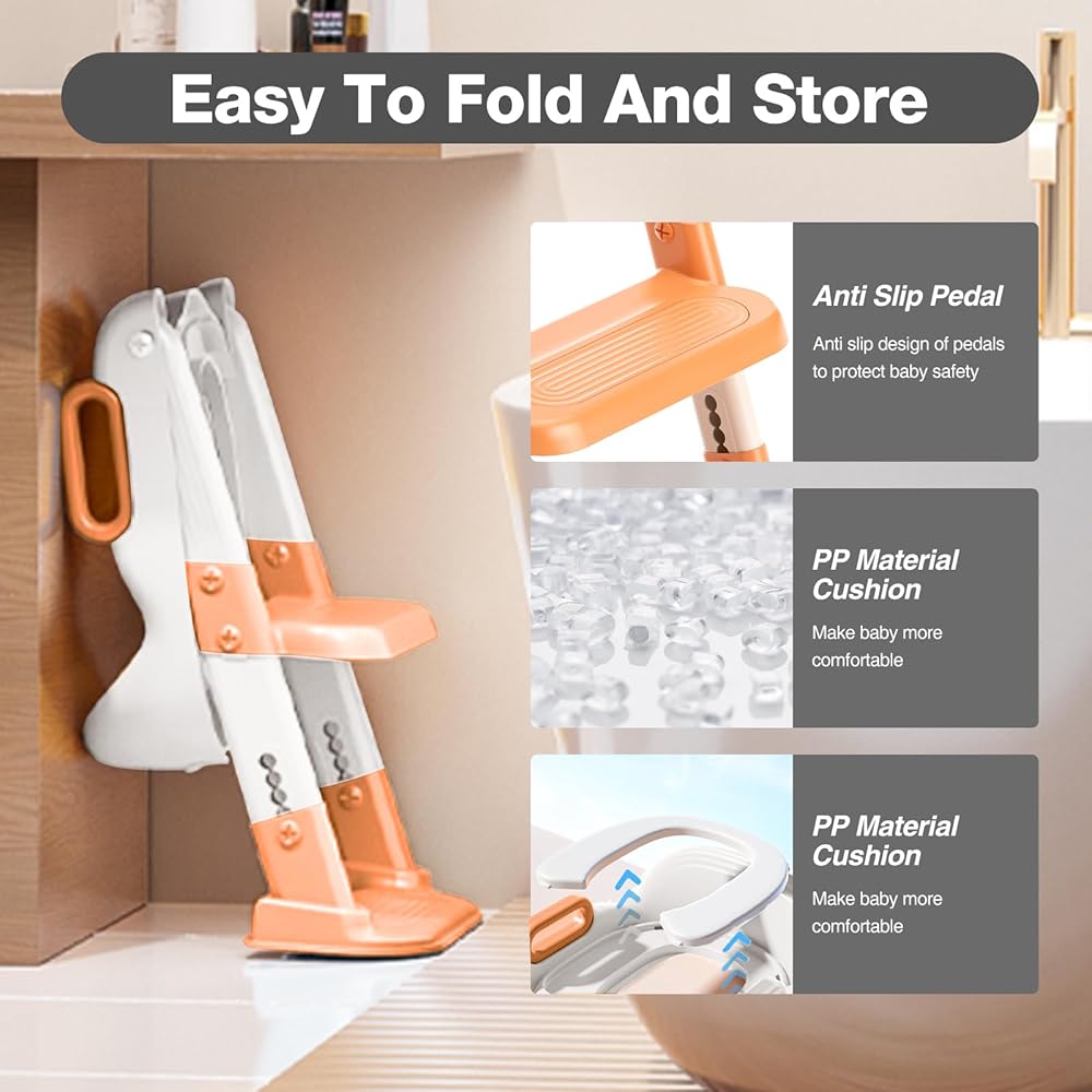 Adjustable angle and height and foldable design:The angle of the kid ladder can be adjusted to adapt to different arcs of the ground. 5 height adjustable ladder with 5 screw holes at the bottom of the ladder, the adjustment range is about 1-8cm, which can be adjusted according to the height of different toilets. The upper part has two levels of adjustable height, allowing for flexible height adjustment for the baby's growth situation.